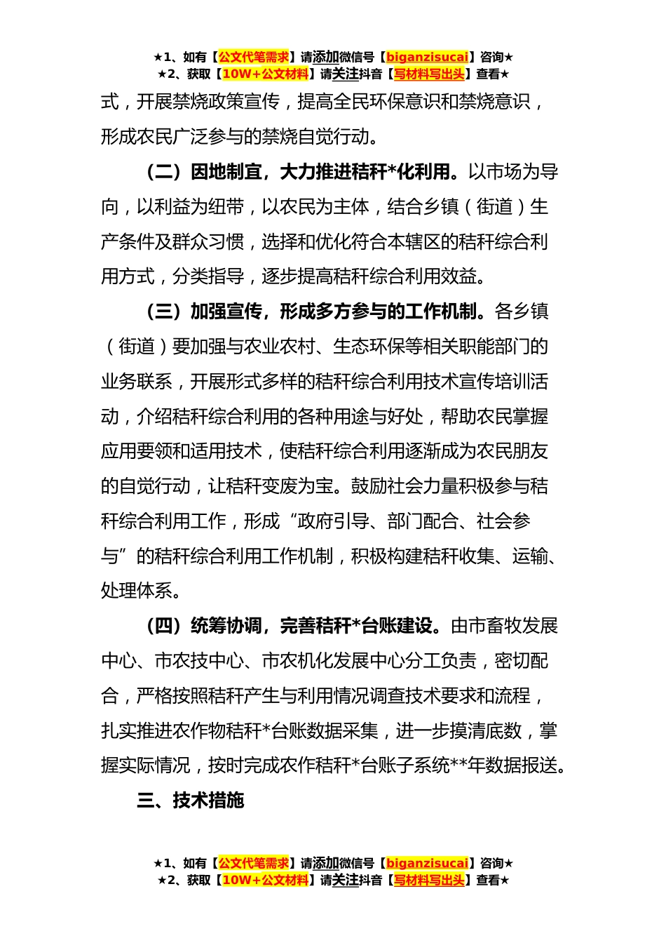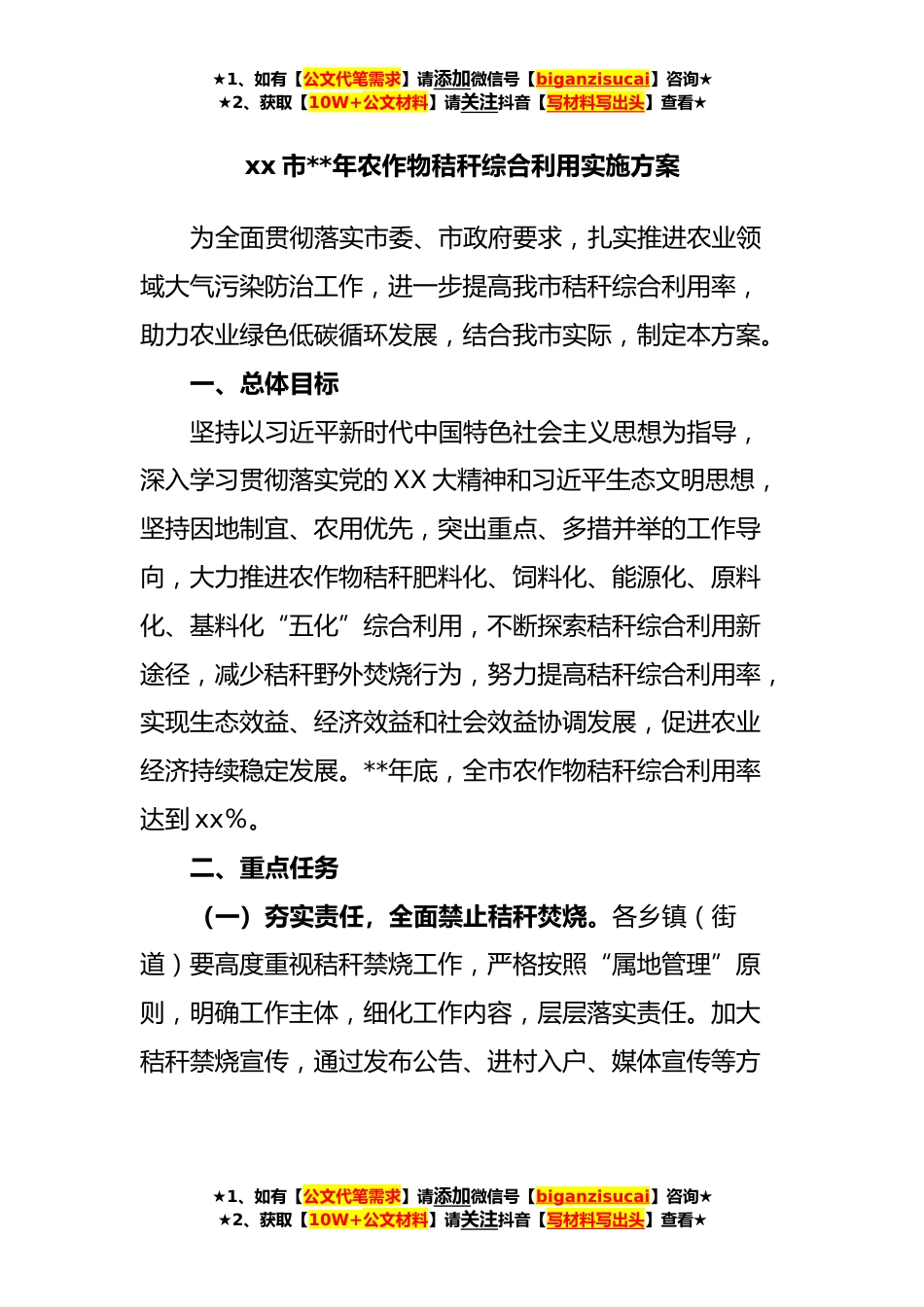 ★1、如有【公文代笔需求】请添加微信号【biganzisucai】咨询★★2、获取【10W+公文材料】请关注抖音【写材料写出头】查看★xx市**年农作物秸秆综合利用实施方案为全面贯彻落实市委、市政府要求,扎实推进农业领域大气污染防治工作,进一步提高我市秸秆综合利用率,助力农业绿色低碳循环发展,结合我市实际,制定本方案。一、总体目标坚持以习近平新时代中国特色社会主义思想为指导,深入学习贯彻落实党的XX大精神和习近平生态文明思想,坚持因地制宜、农用优先,突出重点、多措并举的工作导向,大力推进农作物秸秆肥料化、饲料化、能源化、原料化、基料化“五化”综合利用,不断探索秸秆综合利用新途径,减少秸秆野外焚烧行为,努力提高秸秆综合利用率,实现生态效益、经济效益和社会效益协调发展,促进农业经济...