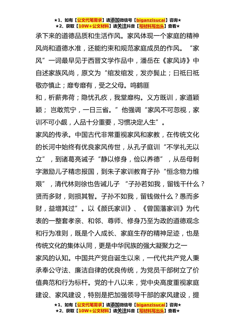 ★1、如有【公文代笔需求】请添加微信号【biganzisucai】咨询★★2、获取【10W+公文材料】请关注抖音【写材料写出头】查看★党课:关于家凤那些事家庭是社会的基本细胞,是人生的第一所学校。优良家风是营造诚信友善经济社会环境的宝贵*,所蕴含的价值理念与社会主义价值观具有高度一致性。家庭家教家风既是家事,也是国事,关系个人健康成长、社会和谐稳定和国家繁荣发展,对党员干部队*设有着重要意义。充分挖掘和弘扬优良家教家风,以清正严明的家教家风要求自己、要求家人,才能使千千万万家庭的好家教、好家风支撑起全社会的好风气,才能使千千万万个家庭成为国家发展、民族进步、社会和谐的重要基点,才能形成爱国爱家、相亲相爱、向上向善、共建共享的家庭文明新风尚,从而凝聚起实现中国梦的磅礴伟力。今...