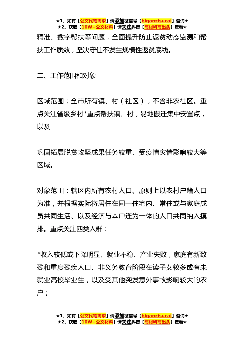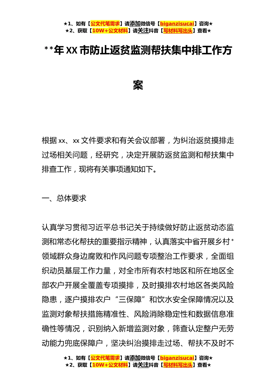 ★1、如有【公文代笔需求】请添加微信号【biganzisucai】咨询★★2、获取【10W+公文材料】请关注抖音【写材料写出头】查看★**年XX市防止返贫监测帮扶集中排工作方案根据xx、xx文件要求和有关会议部署,为纠治返贫摸排走过场相关问题,经研究,决定开展防返贫监测和帮扶集中排查工作,现将有关事项通知如下。一、总体要求认真学习贯彻习近平总书记关于持续做好防止返贫动态监测和常态化帮扶的重要指示精神,认真落实中省开展乡村*领域群众身边腐败和作风问题专项整治工作要求,全面组织动员基层工作力量,对全市所有农村地区和所在地区全部农户开展全覆盖专项摸排,及时摸排农村地区各类风险隐患,逐户摸排农户“三保障”和饮水安全保障情况以及监测对象帮扶措施精准性、风险消除稳定性和数据信息准确性等情况,识...