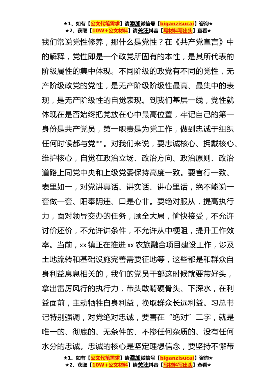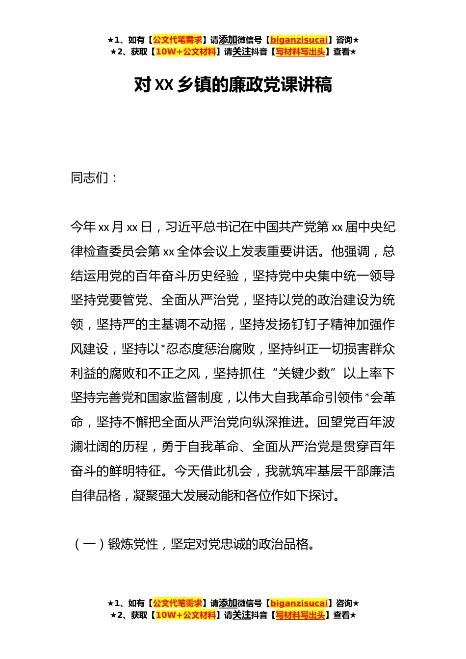 ★1、如有【公文代笔需求】请添加微信号【biganzisucai】咨询★★2、获取【10W+公文材料】请关注抖音【写材料写出头】查看★对XX乡镇的廉政党课讲稿同志们:今年xx月xx日,习近平总书记在中国共产党第xx届中央纪律检查委员会第xx全体会议上发表重要讲话。他强调,总结运用党的百年奋斗历史经验,坚持党中央集中统一领导坚持党要管党、全面从严治党,坚持以党的政治建设为统领,坚持严的主基调不动摇,坚持发扬钉钉子精神加强作风建设,坚持以*忍态度惩治腐败,坚持纠正一切损害群众利益的腐败和不正之风,坚持抓住“关键少数”以上率下坚持完善党和国家监督制度,以伟大自我革命引领伟*会革命,坚持不懈把全面从严治党向纵深推进。回望党百年波澜壮阔的历程,勇于自我革命、全面从严治党是贯穿百年奋斗的鲜明特征...