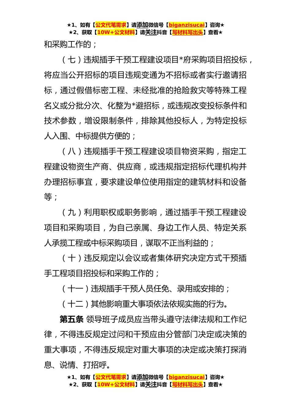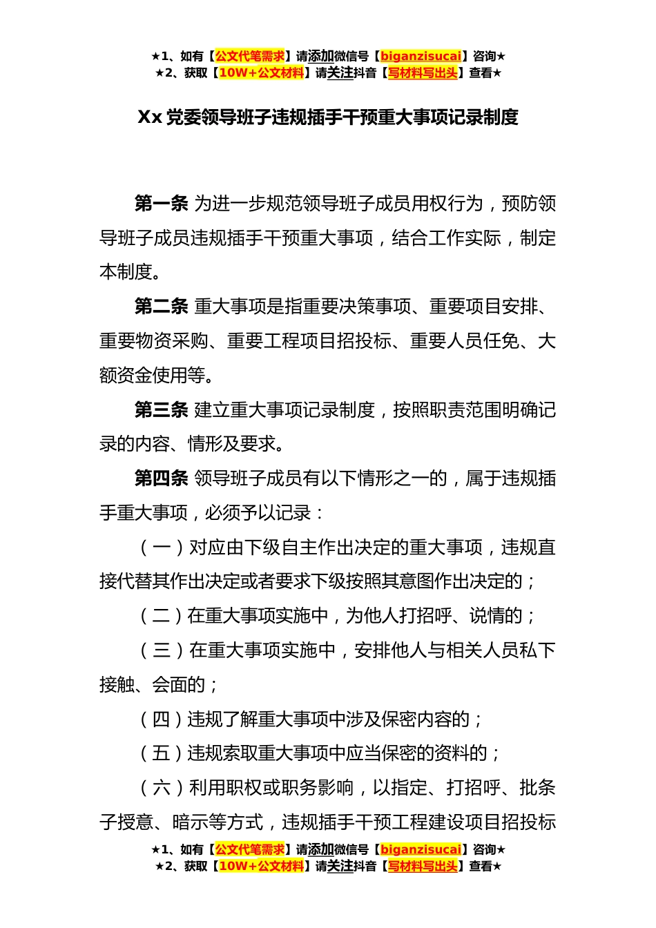 ★1、如有【公文代笔需求】请添加微信号【biganzisucai】咨询★★2、获取【10W+公文材料】请关注抖音【写材料写出头】查看★Xx党委领导班子违规插手干预重大事项记录制度第一条为进一步规范领导班子成员用权行为,预防领导班子成员违规插手干预重大事项,结合工作实际,制定本制度。第二条重大事项是指重要决策事项、重要项目安排、重要物资采购、重要工程项目招投标、重要人员任免、大额资金使用等。第三条建立重大事项记录制度,按照职责范围明确记录的内容、情形及要求。第四条领导班子成员有以下情形之一的,属于违规插手重大事项,必须予以记录:(一)对应由下级自主作出决定的重大事项,违规直接代替其作出决定或者要求下级按照其意图作出决定的;(二)在重大事项实施中,为他人打招呼、说情的;(三)在...