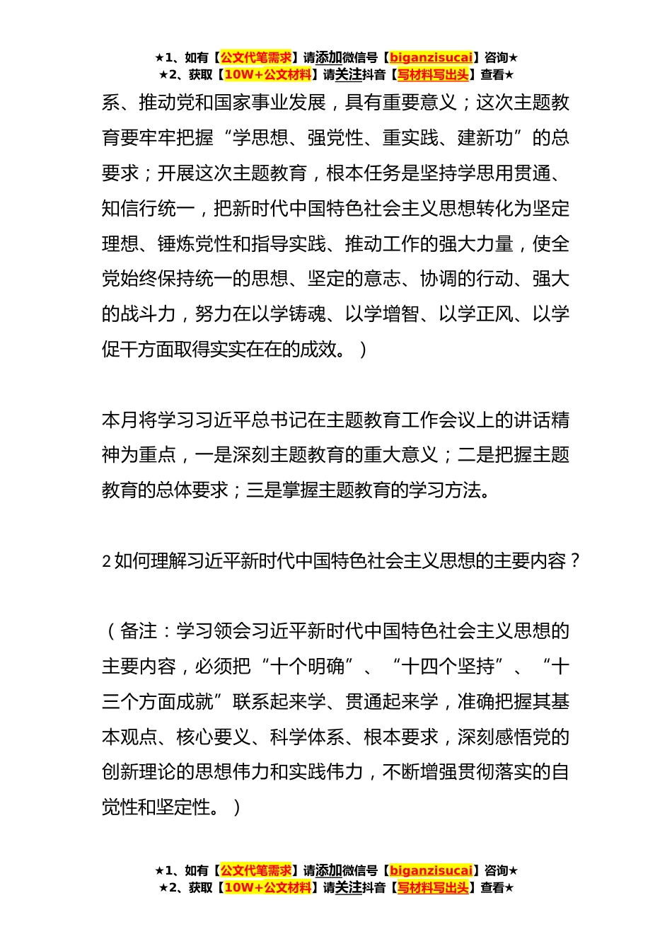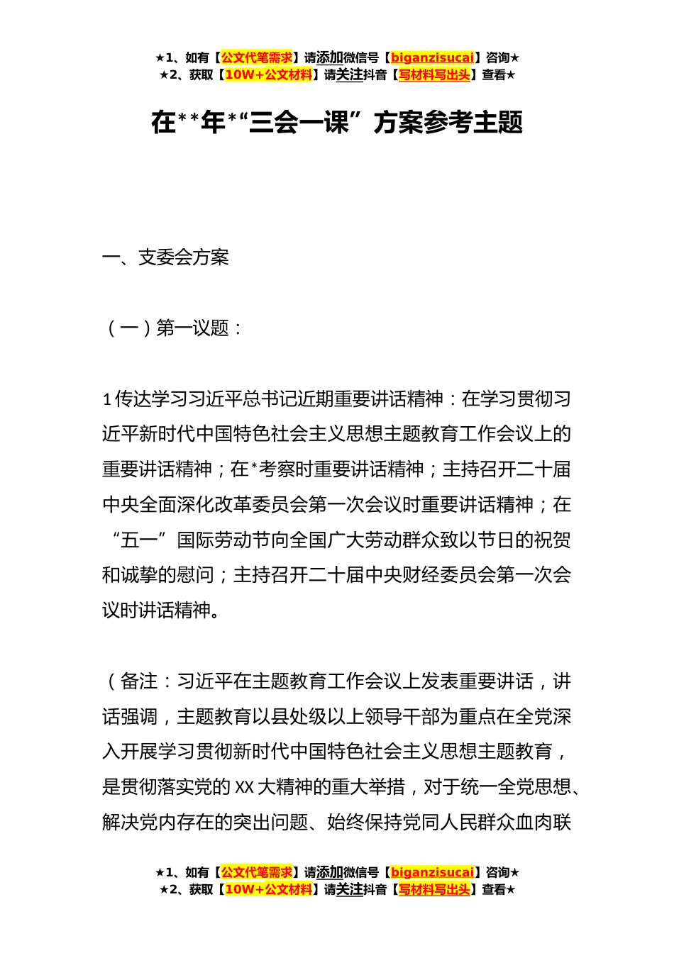 ★1、如有【公文代笔需求】请添加微信号【biganzisucai】咨询★★2、获取【10W+公文材料】请关注抖音【写材料写出头】查看★在**年*“三会一课”方案参考主题一、支委会方案(一)第一议题:1传达学习习近平总书记近期重要讲话精神:在学习贯彻习近平新时代中国特色社会主义思想主题教育工作会议上的重要讲话精神;在*考察时重要讲话精神;主持召开二十届中央全面深化改革委员会第一次会议时重要讲话精神;在“五一”国际劳动节向全国广大劳动群众致以节日的祝贺和诚挚的慰问;主持召开二十届中央财经委员会第一次会议时讲话精神。(备注:习近平在主题教育工作会议上发表重要讲话,讲话强调,主题教育以县处级以上领导干部为重点在全党深入开展学习贯彻新时代中国特色社会主义思想主题教育,是贯彻落实党的XX大精...