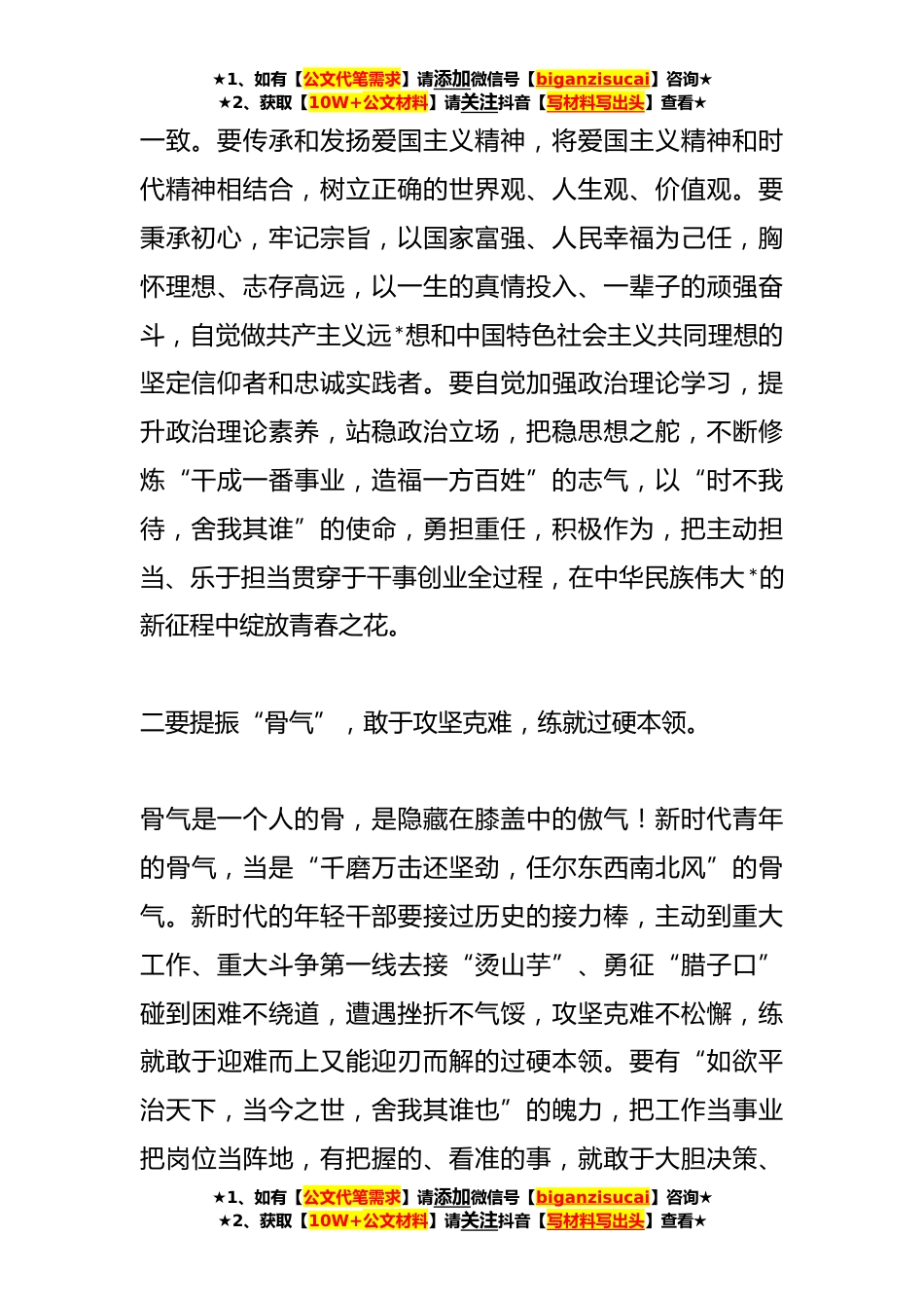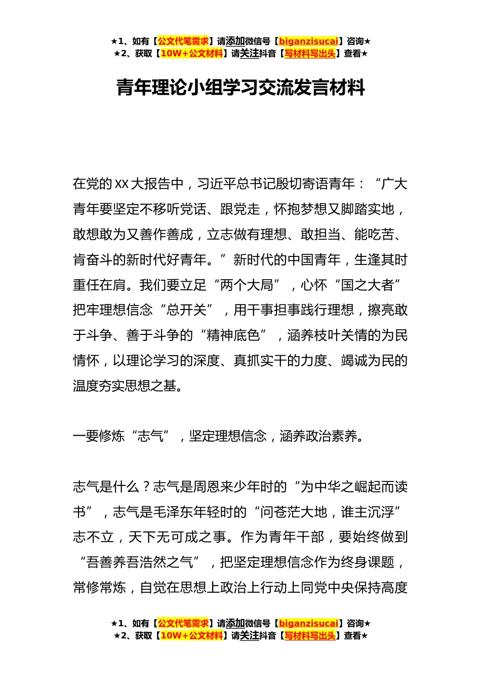 ★1、如有【公文代笔需求】请添加微信号【biganzisucai】咨询★★2、获取【10W+公文材料】请关注抖音【写材料写出头】查看★青年理论小组学习交流发言材料在党的XX大报告中,习近平总书记殷切寄语青年:“广大青年要坚定不移听党话、跟党走,怀抱梦想又脚踏实地,敢想敢为又善作善成,立志做有理想、敢担当、能吃苦、肯奋斗的新时代好青年。”新时代的中国青年,生逢其时重任在肩。我们要立足“两个大局”,心怀“国之大者”把牢理想信念“总开关”,用干事担事践行理想,擦亮敢于斗争、善于斗争的“精神底色”,涵养枝叶关情的为民情怀,以理论学习的深度、真抓实干的力度、竭诚为民的温度夯实思想之基。一要修炼“志气”,坚定理想信念,涵养政治素养。志气是什么?志气是周恩来少年时的“为中华之崛起而读书”...