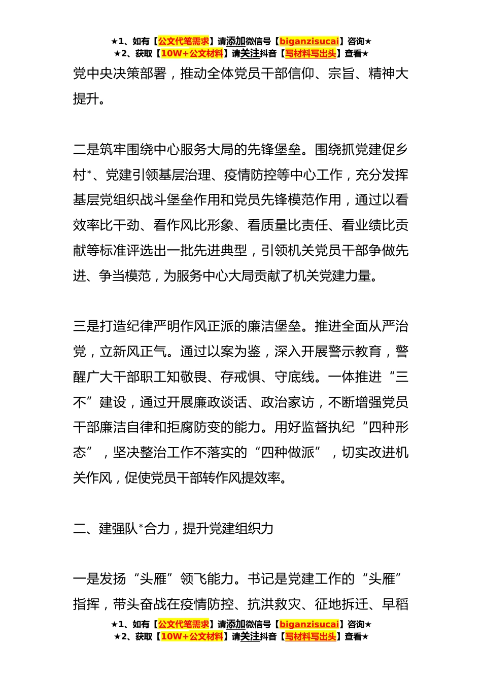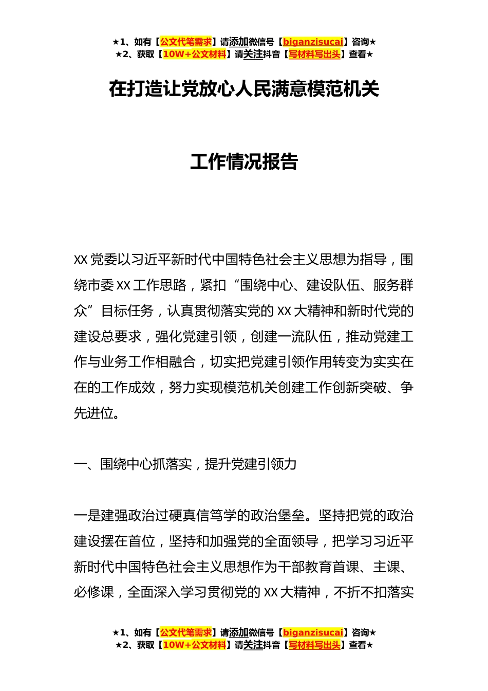 ★1、如有【公文代笔需求】请添加微信号【biganzisucai】咨询★★2、获取【10W+公文材料】请关注抖音【写材料写出头】查看★在打造让党放心人民满意模范机关工作情况报告XX党委以习近平新时代中国特色社会主义思想为指导,围绕市委XX工作思路,紧扣“围绕中心、建设队伍、服务群众”目标任务,认真贯彻落实党的XX大精神和新时代党的建设总要求,强化党建引领,创建一流队伍,推动党建工作与业务工作相融合,切实把党建引领作用转变为实实在在的工作成效,努力实现模范机关创建工作创新突破、争先进位。一、围绕中心抓落实,提升党建引领力一是建强政治过硬真信笃学的政治堡垒。坚持把党的政治建设摆在首位,坚持和加强党的全面领导,把学习习近平新时代中国特色社会主义思想作为干部教育首课、主课、必修课,全面...