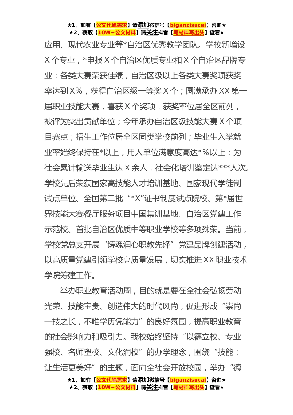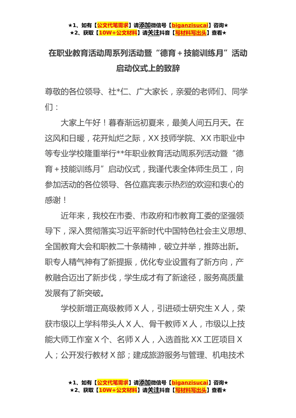 ★1、如有【公文代笔需求】请添加微信号【biganzisucai】咨询★★2、获取【10W+公文材料】请关注抖音【写材料写出头】查看★在职业教育活动周系列活动暨“德育+技能训练月”活动启动仪式上的致辞尊敬的各位领导、社*仁、广大家长,亲爱的老师们、同学们:大家上午好!暮春渐远初夏来,最美人间五月天。在这风和日暖,花开灿烂之际,XX技师学院、XX市职业中等专业学校隆重举行**年职业教育活动周系列活动暨“德育+技能训练月”启动仪式,我谨代表全体师生员工,向参加活动的各位领导、各位嘉宾表示热烈的欢迎和衷心的感谢!近年来,我校在市委、市政府和市教育工委的坚强领导下,深入贯彻落实习近平新时代中国特色社会主义思想、全国教育大会和职教二十条精神,破立并举,推陈出新。职专人精气神有了新提振,优化...