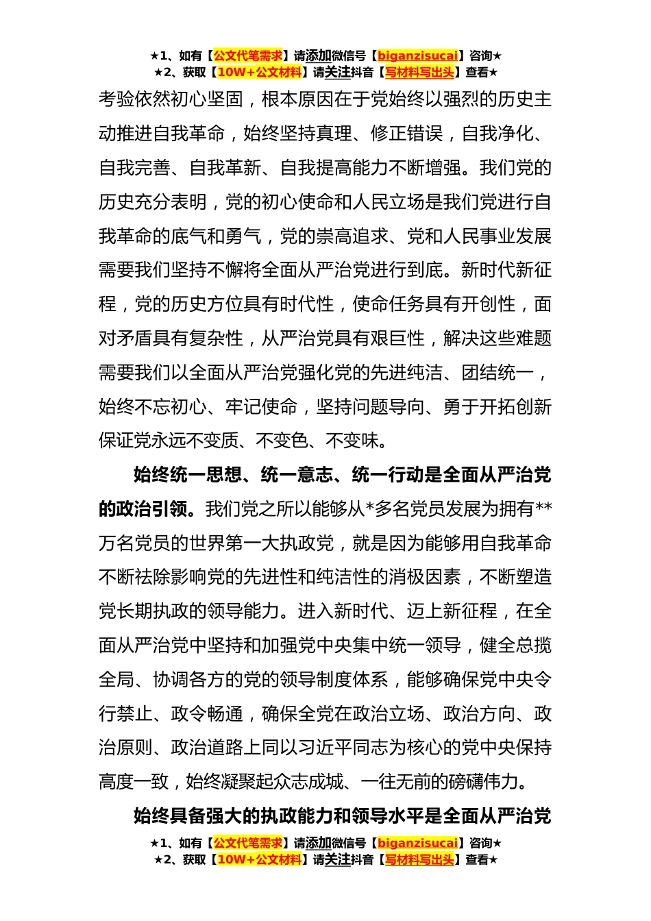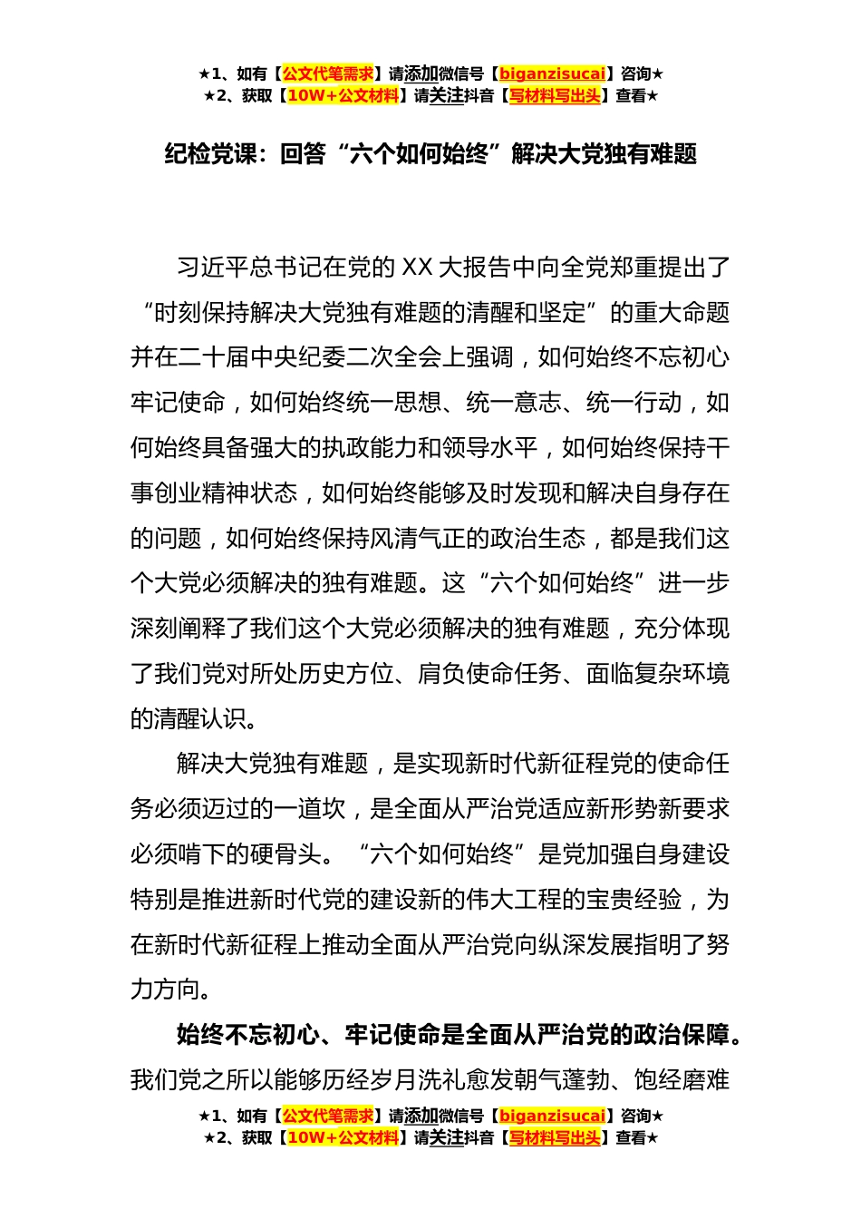 ★1、如有【公文代笔需求】请添加微信号【biganzisucai】咨询★★2、获取【10W+公文材料】请关注抖音【写材料写出头】查看★纪检党课:回答“六个如何始终”解决大党独有难题习近平总书记在党的XX大报告中向全党郑重提出了“时刻保持解决大党独有难题的清醒和坚定”的重大命题并在二十届中央纪委二次全会上强调,如何始终不忘初心牢记使命,如何始终统一思想、统一意志、统一行动,如何始终具备强大的执政能力和领导水平,如何始终保持干事创业精神状态,如何始终能够及时发现和解决自身存在的问题,如何始终保持风清气正的政治生态,都是我们这个大党必须解决的独有难题。这“六个如何始终”进一步深刻阐释了我们这个大党必须解决的独有难题,充分体现了我们党对所处历史方位、肩负使命任务、面临复杂环境的清醒...