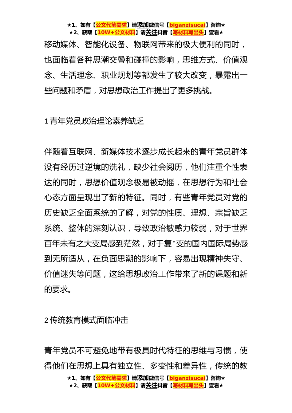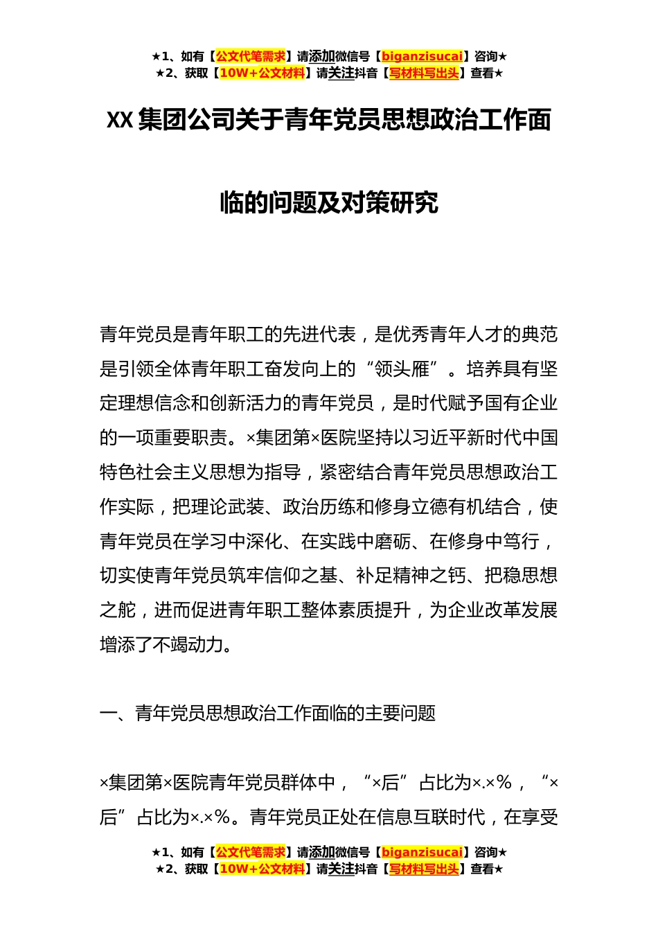 ★1、如有【公文代笔需求】请添加微信号【biganzisucai】咨询★★2、获取【10W+公文材料】请关注抖音【写材料写出头】查看★XX集团公司关于青年党员思想政治工作面临的问题及对策研究青年党员是青年职工的先进代表,是优秀青年人才的典范是引领全体青年职工奋发向上的“领头雁”。培养具有坚定理想信念和创新活力的青年党员,是时代赋予国有企业的一项重要职责。×集团第×医院坚持以习近平新时代中国特色社会主义思想为指导,紧密结合青年党员思想政治工作实际,把理论武装、政治历练和修身立德有机结合,使青年党员在学习中深化、在实践中磨砺、在修身中笃行,切实使青年党员筑牢信仰之基、补足精神之钙、把稳思想之舵,进而促进青年职工整体素质提升,为企业改革发展增添了不竭动力。一、青年党员思想政治工作...