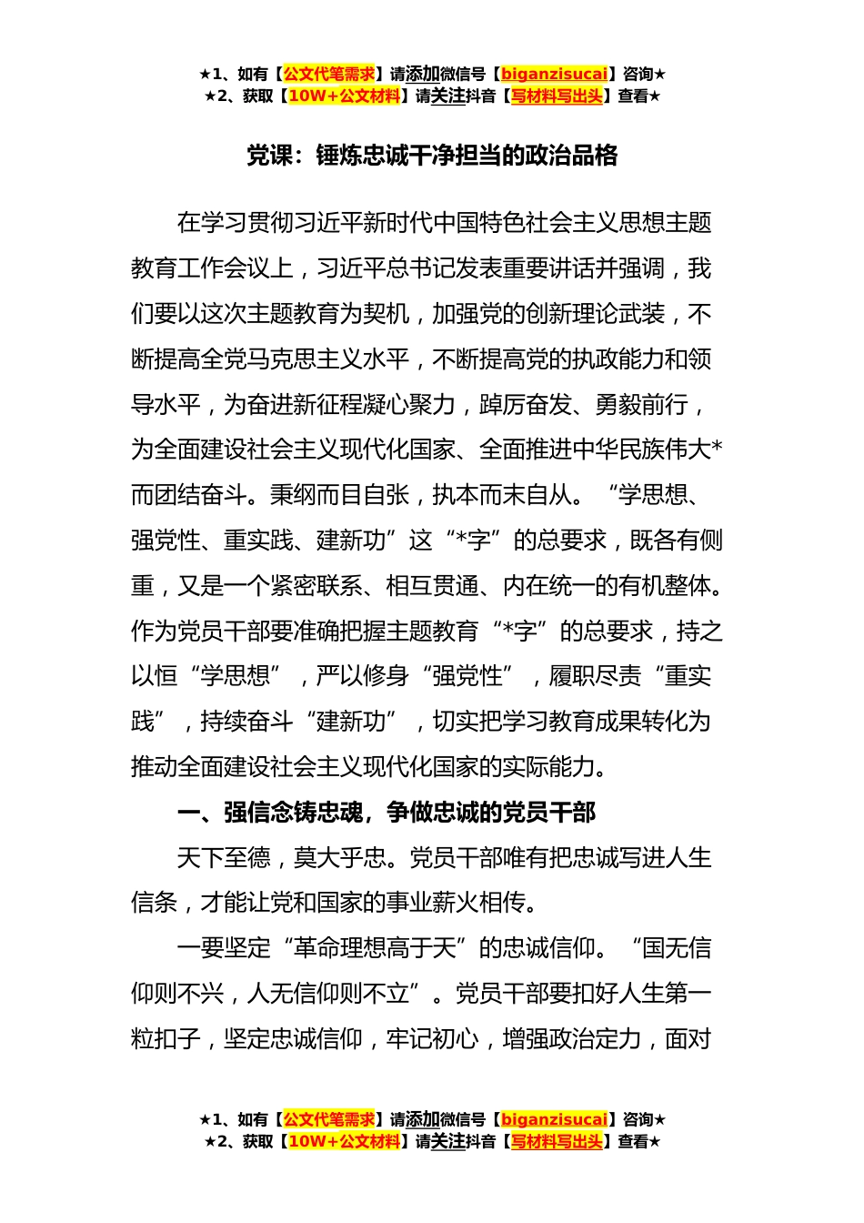 ★1、如有【公文代笔需求】请添加微信号【biganzisucai】咨询★★2、获取【10W+公文材料】请关注抖音【写材料写出头】查看★党课:锤炼忠诚干净担当的政治品格在学习贯彻习近平新时代中国特色社会主义思想主题教育工作会议上,习近平总书记发表重要讲话并强调,我们要以这次主题教育为契机,加强党的创新理论武装,不断提高全党马克思主义水平,不断提高党的执政能力和领导水平,为奋进新征程凝心聚力,踔厉奋发、勇毅前行,为全面建设社会主义现代化国家、全面推进中华民族伟大*而团结奋斗。秉纲而目自张,执本而末自从。“学思想、强党性、重实践、建新功”这“*字”的总要求,既各有侧重,又是一个紧密联系、相互贯通、内在统一的有机整体。作为党员干部要准确把握主题教育“*字”的总要求,持之以恒“学思想”...