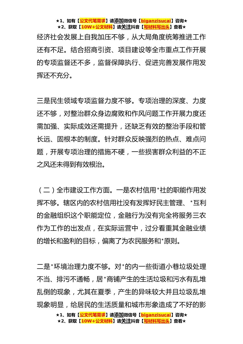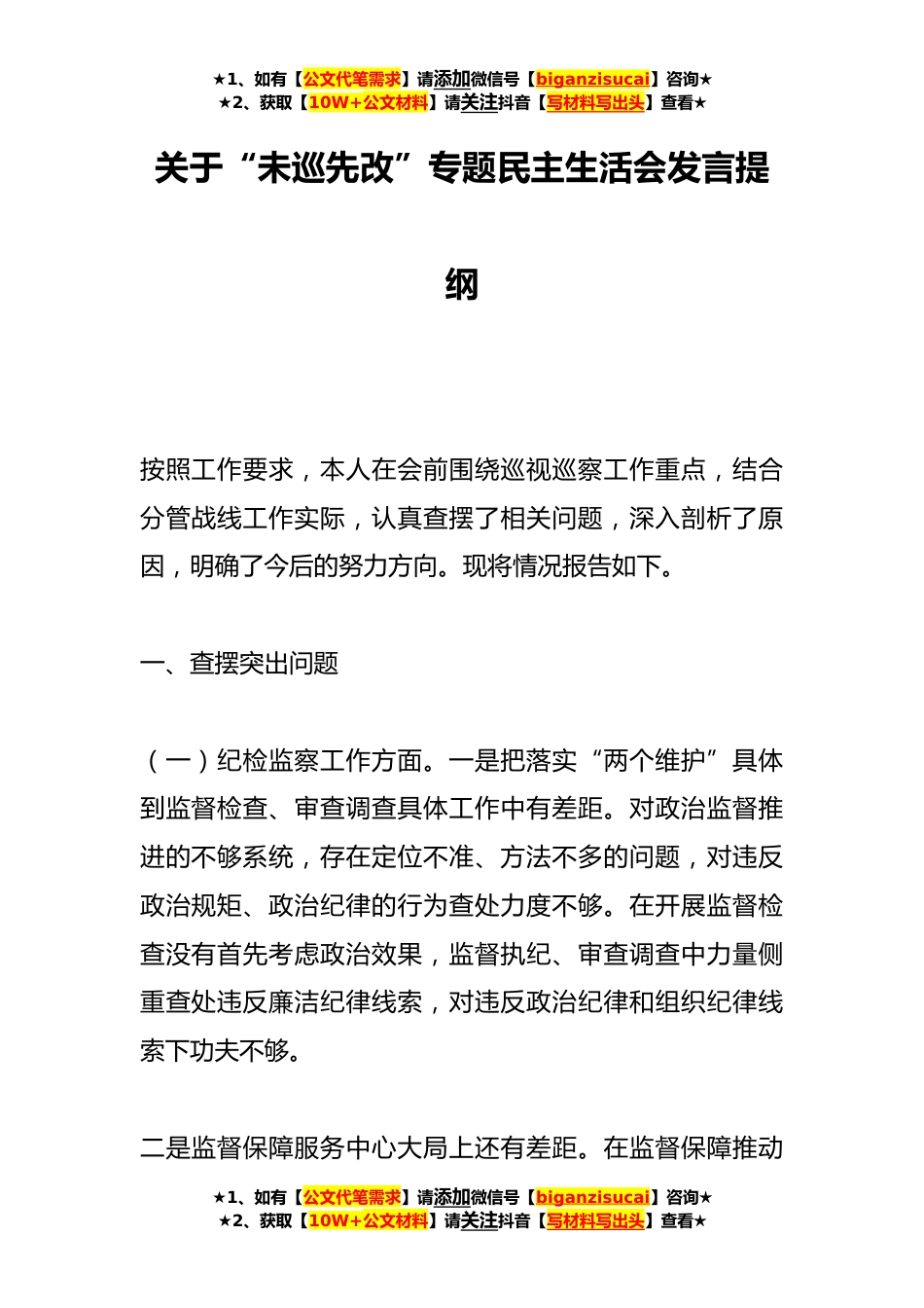 ★1、如有【公文代笔需求】请添加微信号【biganzisucai】咨询★★2、获取【10W+公文材料】请关注抖音【写材料写出头】查看★关于“未巡先改”专题民主生活会发言提纲按照工作要求,本人在会前围绕巡视巡察工作重点,结合分管战线工作实际,认真查摆了相关问题,深入剖析了原因,明确了今后的努力方向。现将情况报告如下。一、查摆突出问题(一)纪检监察工作方面。一是把落实“两个维护”具体到监督检查、审查调查具体工作中有差距。对政治监督推进的不够系统,存在定位不准、方法不多的问题,对违反政治规矩、政治纪律的行为查处力度不够。在开展监督检查没有首先考虑政治效果,监督执纪、审查调查中力量侧重查处违反廉洁纪律线索,对违反政治纪律和组织纪律线索下功夫不够。二是监督保障服务中心大局上还有差距...