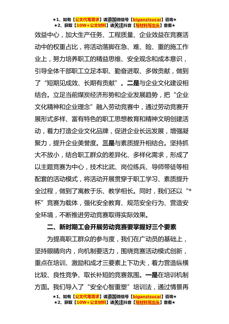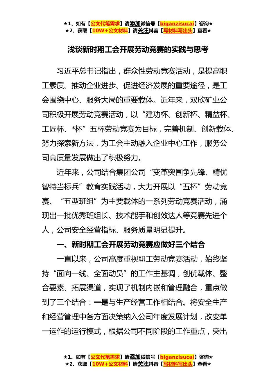 ★1、如有【公文代笔需求】请添加微信号【biganzisucai】咨询★★2、获取【10W+公文材料】请关注抖音【写材料写出头】查看★浅谈新时期工会开展劳动竞赛的实践与思考习近平总书记指出,群众性劳动竞赛活动,是提高职工素质、推动企业进步、促进经济发展的重要途径,是工会围绕中心、服务大局的重要载体。近年来,双欣矿业公司积极开展劳动竞赛活动,以“建功杯、创新杯、精益杯、工匠杯、*杯”五杯劳动竞赛为目标,完善机制、创新载体、努力探索新方法,为工会主动融入企业中心工作,服务公司高质量发展做出了积极努力。近年来,公司结合集团公司“变革突围争先锋、精优智特当标兵”教育实践活动,大力开展以“五杯”劳动竞赛、“五型班组”为主要载体的一系列劳动竞赛活动,涌现出一批优秀班组长、技术能手和创效...