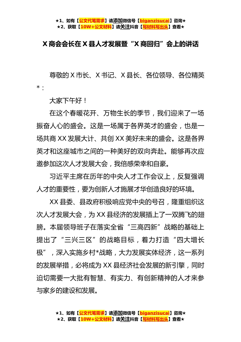 ★1、如有【公文代笔需求】请添加微信号【biganzisucai】咨询★★2、获取【10W+公文材料】请关注抖音【写材料写出头】查看★X商会会长在X县人才发展暨“X商回归”会上的讲话尊敬的X市长、X书记、X县长、各位领导、各位精英*:大家下午好!在这个春暖花开、万物生长的季节,我们迎来了一场振奋人心的盛会。这是一场属于各界英才的盛会,也是一场共商XX发展大计、共创XX美好未来的盛会。这是各界英才和这座城市之间的一种美好的双向奔赴。能够再次应邀参加这次人才发展大会,我倍感荣幸和自豪。习近平主席在历年的中央人才工作会议上,反复强调人才的重要性,要为创新人才施展才华创造良好的环境。XX县委、县政府积极响应党中央的号召,隆重组织这次人才发展大会,为XX县经济的发展插上了一双腾飞的翅膀。本届领导班...