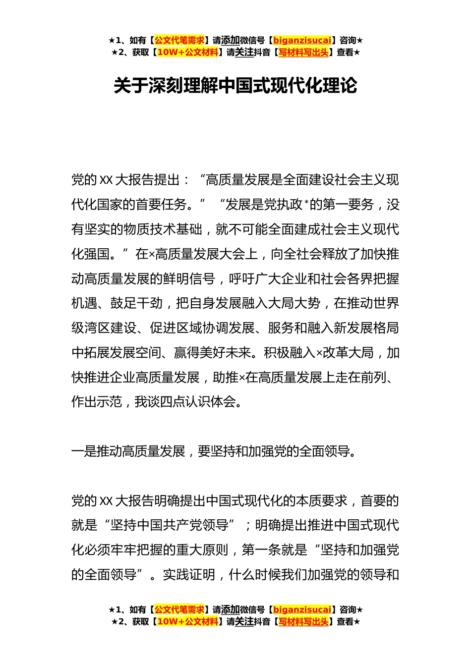 ★1、如有【公文代笔需求】请添加微信号【biganzisucai】咨询★★2、获取【10W+公文材料】请关注抖音【写材料写出头】查看★关于深刻理解中国式现代化理论党的XX大报告提出:“高质量发展是全面建设社会主义现代化国家的首要任务。”“发展是党执政*的第一要务,没有坚实的物质技术基础,就不可能全面建成社会主义现代化强国。”在×高质量发展大会上,向全社会释放了加快推动高质量发展的鲜明信号,呼吁广大企业和社会各界把握机遇、鼓足干劲,把自身发展融入大局大势,在推动世界级湾区建设、促进区域协调发展、服务和融入新发展格局中拓展发展空间、赢得美好未来。积极融入×改革大局,加快推进企业高质量发展,助推×在高质量发展上走在前列、作出示范,我谈四点认识体会。一是推动高质量发展,要坚持和加强党...