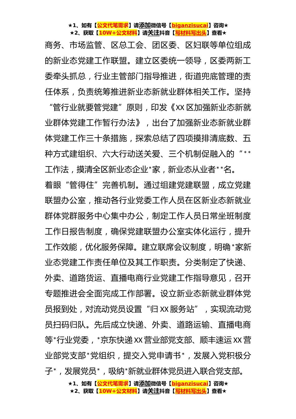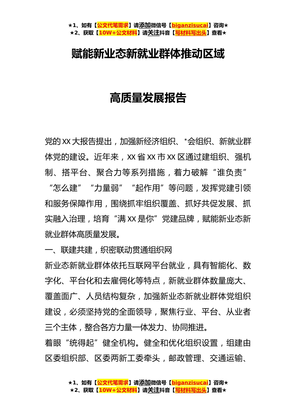 ★1、如有【公文代笔需求】请添加微信号【biganzisucai】咨询★★2、获取【10W+公文材料】请关注抖音【写材料写出头】查看★赋能新业态新就业群体推动区域高质量发展报告党的XX大报告提出,加强新经济组织、*会组织、新就业群体党的建设。近年来,XX省XX市XX区通过建组织、强机制、搭平台、聚合力等系列措施,着力破解“谁负责”“怎么建”“力量弱”“起作用”等问题,发挥党建引领和服务保障作用,围绕抓牢组织覆盖、抓好共促发展、抓实融入治理,培育“满XX是你”党建品牌,赋能新业态新就业群体高质量发展。一、联建共建,织密联动贯通组织网新业态新就业群体依托互联网平台就业,具有智能化、数字化、平台化和去雇佣化等特点,新就业群体数量庞大、覆盖面广、人员结构复杂,加强新业态新就业群体党组织建设,...