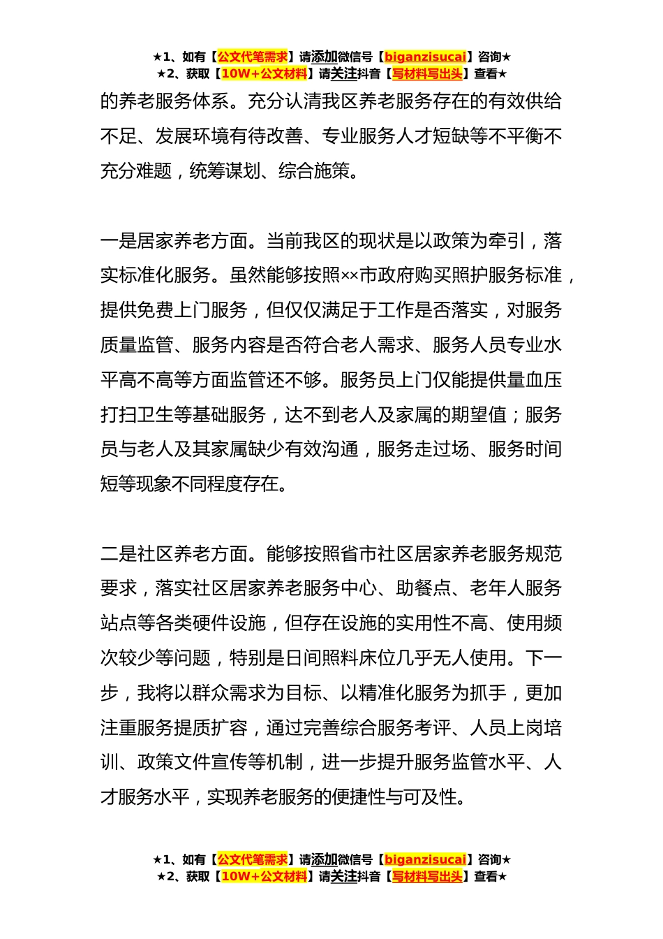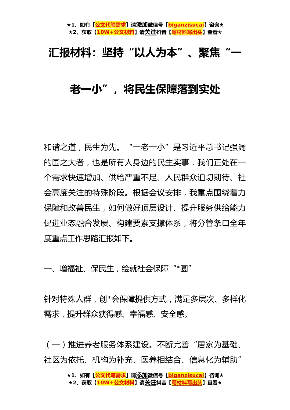 ★1、如有【公文代笔需求】请添加微信号【biganzisucai】咨询★★2、获取【10W+公文材料】请关注抖音【写材料写出头】查看★汇报材料:坚持“以人为本”、聚焦“一老一小”,将民生保障落到实处和谐之道,民生为先。“一老一小”是习近平总书记强调的国之大者,也是所有人身边的民生实事,我们正处在一个需求快速增加、供给严重不足、人民群众迫切期待、社会高度关注的特殊阶段。根据会议安排,我重点围绕着力保障和改善民生,如何做好顶层设计、提升服务供给能力促进业态融合发展、构建要素支撑体系,将分管条口全年度重点工作思路汇报如下。一、增福祉、保民生,绘就社会保障“*圆”针对特殊人群,创*会保障提供方式,满足多层次、多样化需求,提升群众获得感、幸福感、安全感。(一)推进养老服务体系建设。不...