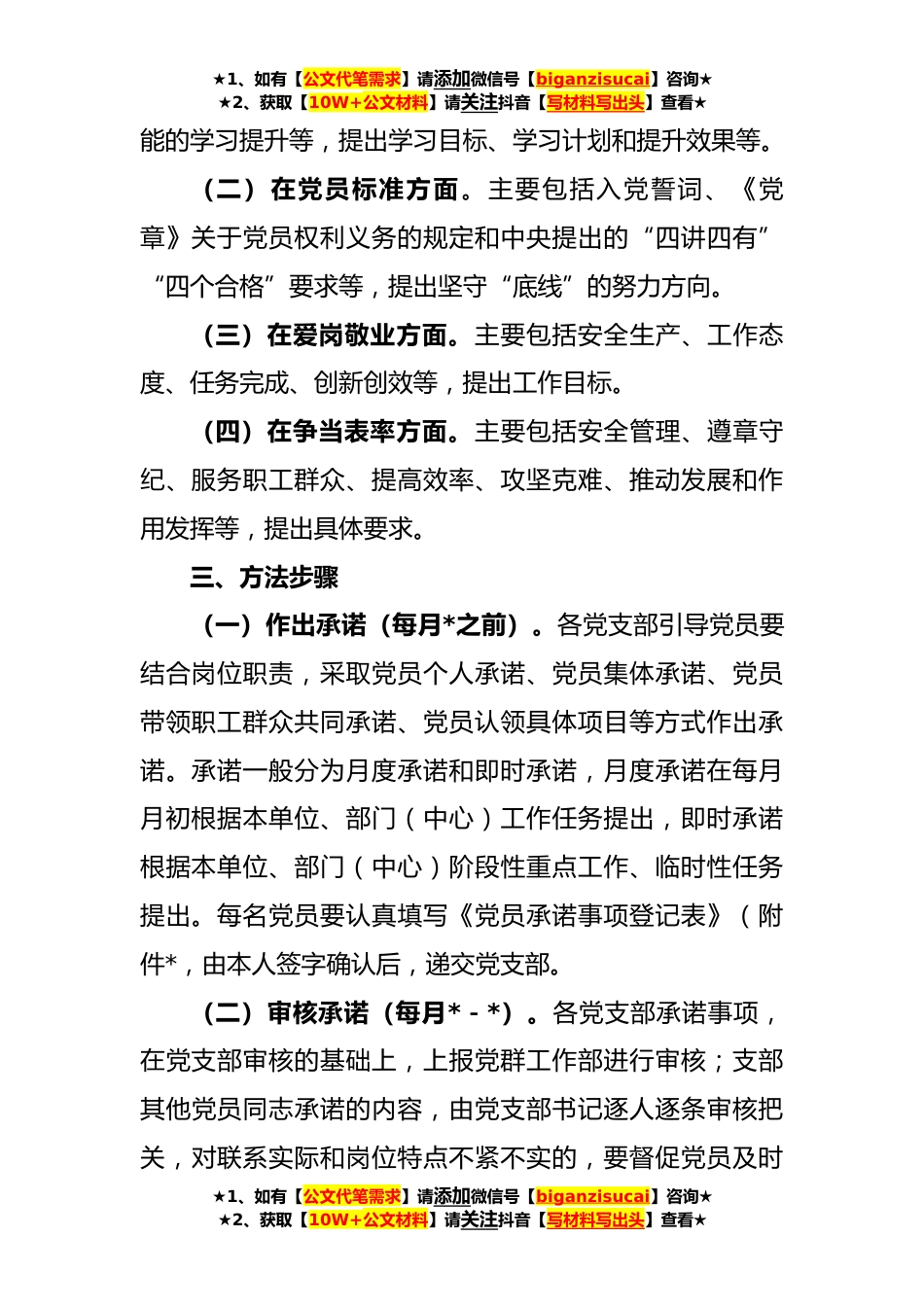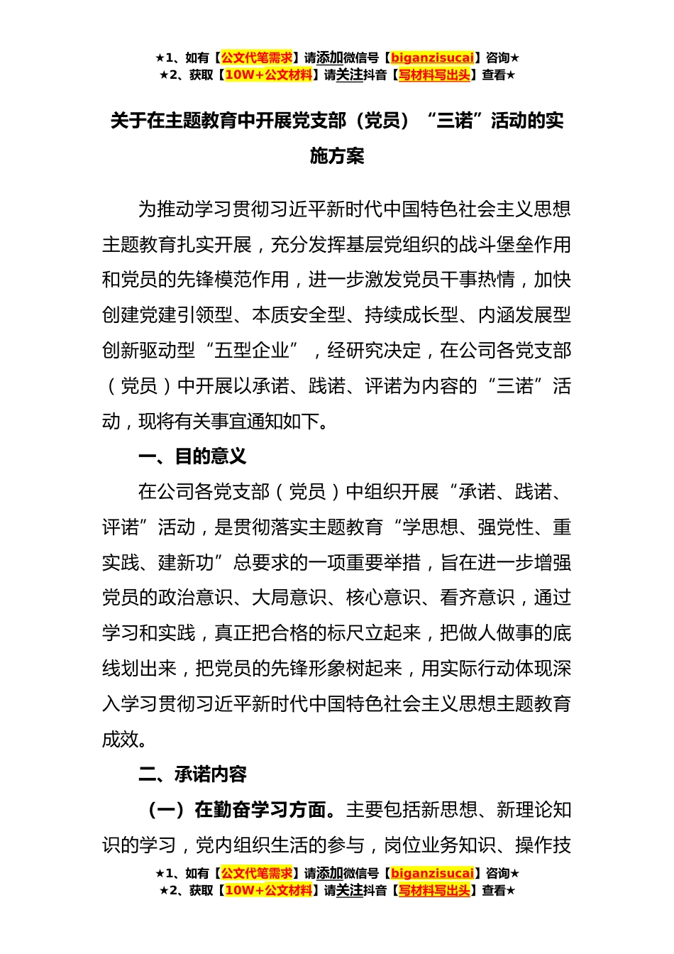 ★1、如有【公文代笔需求】请添加微信号【biganzisucai】咨询★★2、获取【10W+公文材料】请关注抖音【写材料写出头】查看★关于在主题教育中开展党支部(党员)“三诺”活动的实施方案为推动学习贯彻习近平新时代中国特色社会主义思想主题教育扎实开展,充分发挥基层党组织的战斗堡垒作用和党员的先锋模范作用,进一步激发党员干事热情,加快创建党建引领型、本质安全型、持续成长型、内涵发展型创新驱动型“五型企业”,经研究决定,在公司各党支部(党员)中开展以承诺、践诺、评诺为内容的“三诺”活动,现将有关事宜通知如下。一、目的意义在公司各党支部(党员)中组织开展“承诺、践诺、评诺”活动,是贯彻落实主题教育“学思想、强党性、重实践、建新功”总要求的一项重要举措,旨在进一步增强党员的政治...