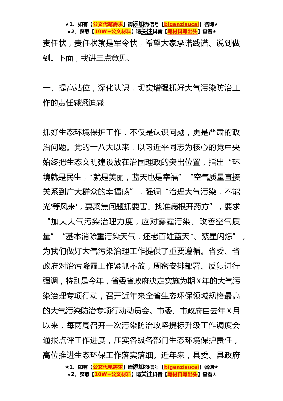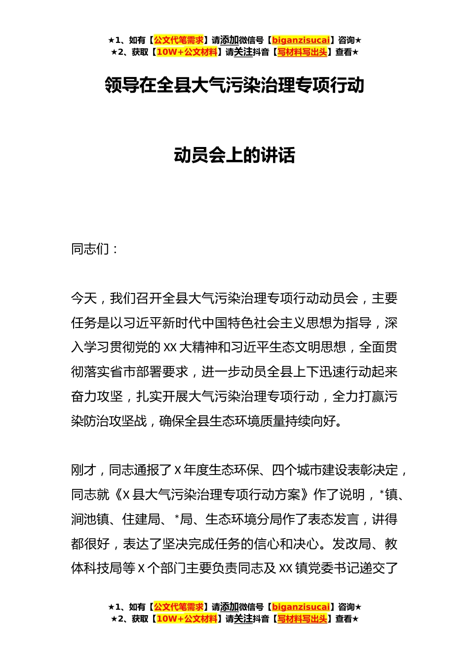 ★1、如有【公文代笔需求】请添加微信号【biganzisucai】咨询★★2、获取【10W+公文材料】请关注抖音【写材料写出头】查看★领导在全县大气污染治理专项行动动员会上的讲话同志们:今天,我们召开全县大气污染治理专项行动动员会,主要任务是以习近平新时代中国特色社会主义思想为指导,深入学习贯彻党的XX大精神和习近平生态文明思想,全面贯彻落实省市部署要求,进一步动员全县上下迅速行动起来奋力攻坚,扎实开展大气污染治理专项行动,全力打赢污染防治攻坚战,确保全县生态环境质量持续向好。刚才,同志通报了X年度生态环保、四个城市建设表彰决定,同志就《X县大气污染治理专项行动方案》作了说明,*镇、涧池镇、住建局、*局、生态环境分局作了表态发言,讲得都很好,表达了坚决完成任务的信心和决心。发改...