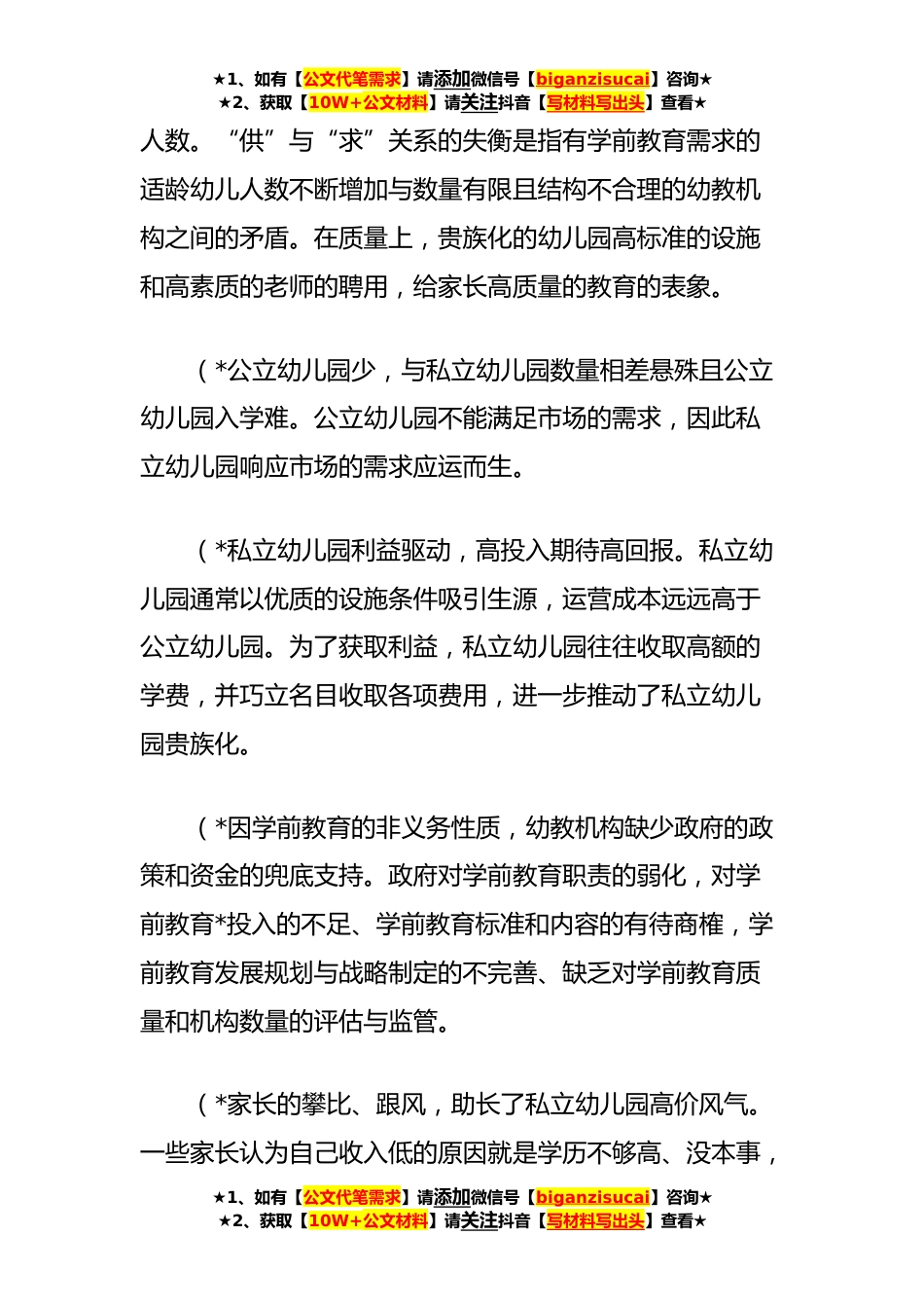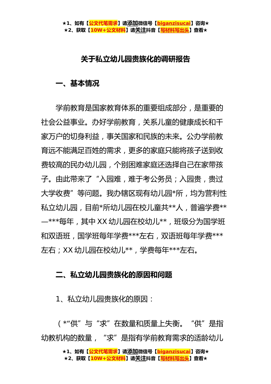 ★1、如有【公文代笔需求】请添加微信号【biganzisucai】咨询★★2、获取【10W+公文材料】请关注抖音【写材料写出头】查看★关于私立幼儿园贵族化的调研报告一、基本情况学前教育是国家教育体系的重要组成部分,是重要的社会公益事业。办好学前教育,关系儿童的健康成长和千家万户的切身利益,事关国家和民族的未来。公办学前教育远不能满足百姓的需求,更多的家庭只能将孩子送到收费较高的民办幼儿园,个别困难家庭还选择自己在家带孩子。由此带来了“入园难,难于考公务员;入园贵,贵过大学收费”等问题。我办辖区现有幼儿园*所,均为营利性私立幼儿园,目前*所幼儿园在校儿童共**人,普遍学费**—***每年,其中XX幼儿园在校幼儿**,班级分为国学班和双语班,国学班每年学费***左右,双语班每年学费***左右;XX...