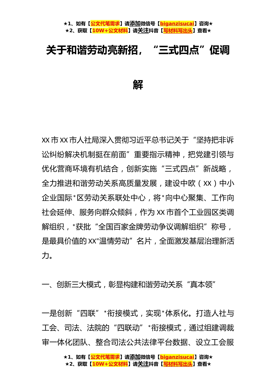 ★1、如有【公文代笔需求】请添加微信号【biganzisucai】咨询★★2、获取【10W+公文材料】请关注抖音【写材料写出头】查看★关于和谐劳动亮新招,“三式四点”促调解XX市XX市人社局深入贯彻习近平总书记关于“坚持把非诉讼纠纷解决机制挺在前面”重要指示精神,把党建引领与优化营商环境有机结合,创新实施“三式四点”新战略,全力推进和谐劳动关系高质量发展,建设中欧(XX)中小企业国际*区劳动关系联处中心,将*向中心聚集、工作向社会延伸、服务向群众倾斜,作为XX市首个工业园区类调解组织,*获批“全国百家金牌劳动争议调解组织”称号,是最具价值的XX“温情劳动”名片,全面激发基层治理新活力。一、创新三大模式,彰显构建和谐劳动关系“真本领”一是创新“四联”*衔接模式,实现*体系化。打造人社与工会...