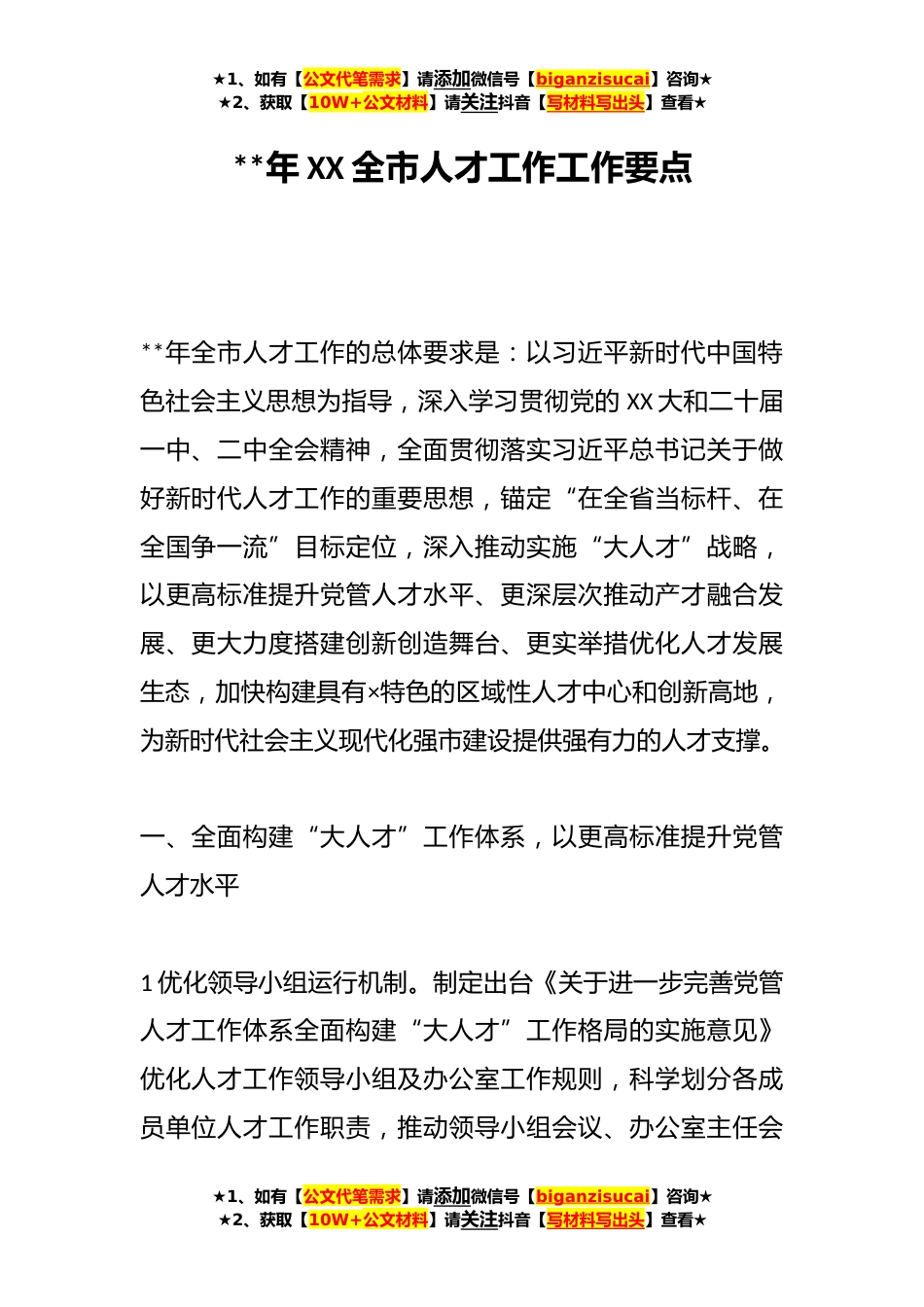★1、如有【公文代笔需求】请添加微信号【biganzisucai】咨询★★2、获取【10W+公文材料】请关注抖音【写材料写出头】查看★**年XX全市人才工作工作要点**年全市人才工作的总体要求是:以习近平新时代中国特色社会主义思想为指导,深入学习贯彻党的XX大和二十届一中、二中全会精神,全面贯彻落实习近平总书记关于做好新时代人才工作的重要思想,锚定“在全省当标杆、在全国争一流”目标定位,深入推动实施“大人才”战略,以更高标准提升党管人才水平、更深层次推动产才融合发展、更大力度搭建创新创造舞台、更实举措优化人才发展生态,加快构建具有×特色的区域性人才中心和创新高地,为新时代社会主义现代化强市建设提供强有力的人才支撑。一、全面构建“大人才”工作体系,以更高标准提升党管人才水平1优化领导...