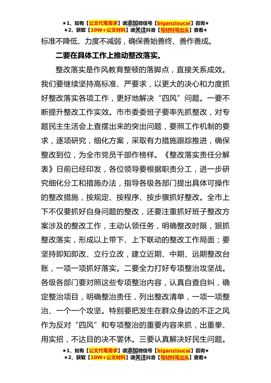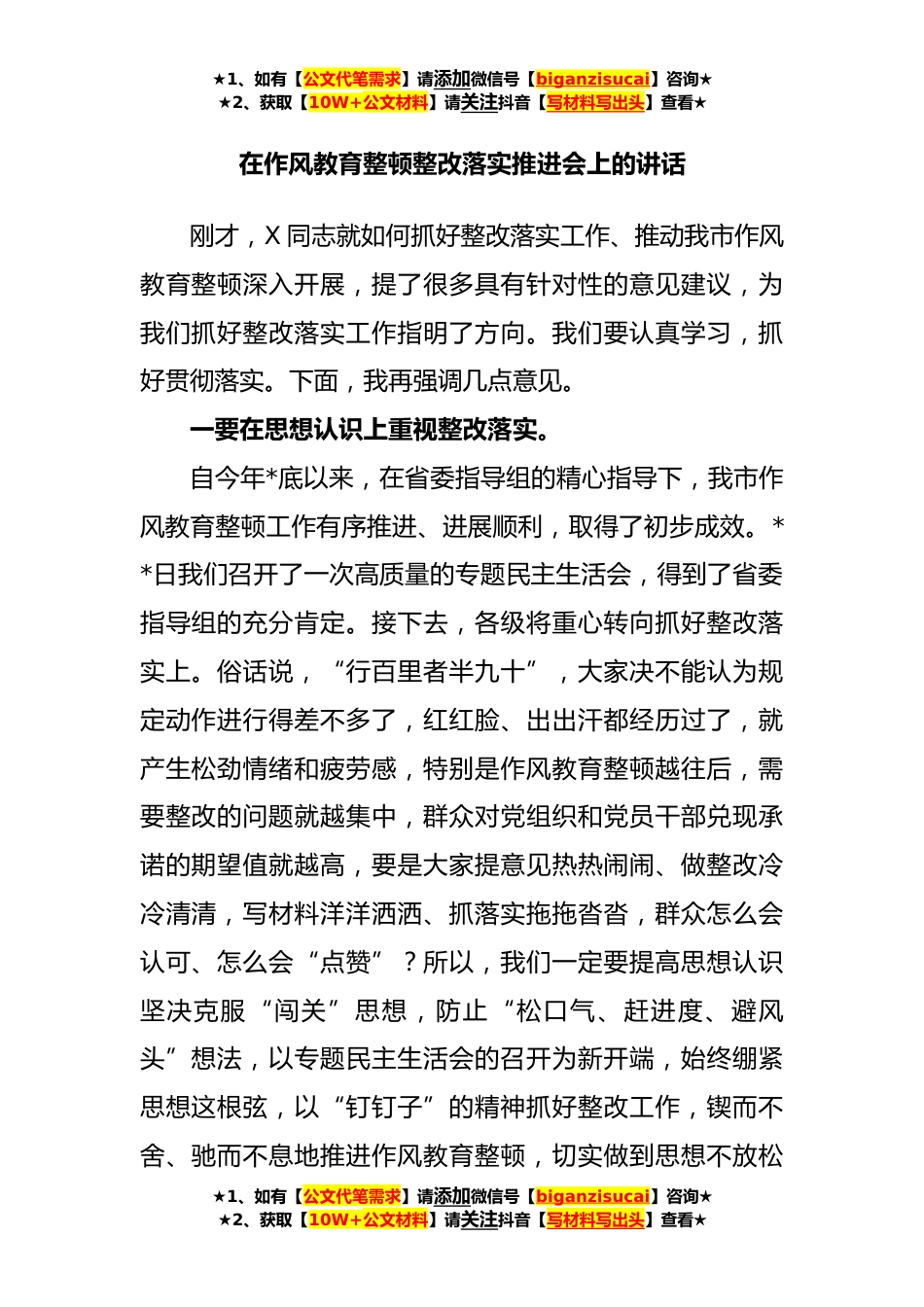 ★1、如有【公文代笔需求】请添加微信号【biganzisucai】咨询★★2、获取【10W+公文材料】请关注抖音【写材料写出头】查看★在作风教育整顿整改落实推进会上的讲话刚才,X同志就如何抓好整改落实工作、推动我市作风教育整顿深入开展,提了很多具有针对性的意见建议,为我们抓好整改落实工作指明了方向。我们要认真学习,抓好贯彻落实。下面,我再强调几点意见。一要在思想认识上重视整改落实。自今年*底以来,在省委指导组的精心指导下,我市作风教育整顿工作有序推进、进展顺利,取得了初步成效。**日我们召开了一次高质量的专题民主生活会,得到了省委指导组的充分肯定。接下去,各级将重心转向抓好整改落实上。俗话说,“行百里者半九十”,大家决不能认为规定动作进行得差不多了,红红脸、出出汗都经历过了,...