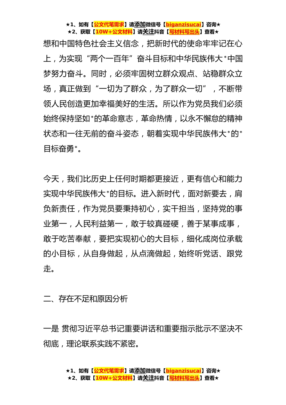 ★1、如有【公文代笔需求】请添加微信号【biganzisucai】咨询★★2、获取【10W+公文材料】请关注抖音【写材料写出头】查看★主题教育第二次集中学习研讨发言材料机关第四支部按照区委“不忘初心、牢记使命”主题教育安排,深入学习贯彻习近平新时代中国特色社会主义思想,通过进一步开展“不忘初心、牢记使命”主题教育,我深刻领会“不忘初心、牢记使命”主题教育的重要意义。在认真开展学习的同时,深入进行调研、深刻检视问题,对照习近平新时代中国特色社会主义思想和党中央决策部署、对照党章党规、对照人民群众的新期待、对照先进典型和身边榜样查问题找差距,剖析根源,整改落实。全面查找个人在初心和使命方面存在的问题。一、学习体会和收获通过学习我认识到,进入新时代,要想分奋力走好新时代长征路,...