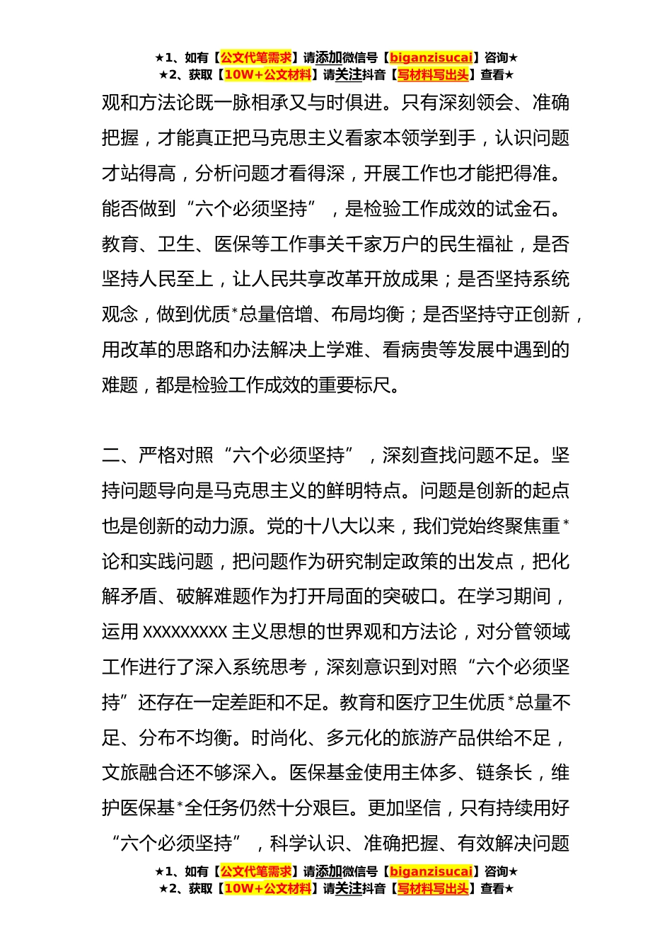 ★1、如有【公文代笔需求】请添加微信号【biganzisucai】咨询★★2、获取【10W+公文材料】请关注抖音【写材料写出头】查看★在党内主题教育读书班上的发言汇编(*)在党内主题教育读书班上的发言开展学习贯彻XXXXXXXXX主义思想主题教育,是党中央为全面贯彻党的**大精神、动员全党同志为完成党的中心任务而团结奋斗所作的重大部署。参加本次主题教育读书班通过认真学习思考,对XXXXXXXXX主义思想的世界观和方法论有了进一步的理解和把握。深刻体会到,只有准确把握“六个必须坚持”的立场观点方法,才能更好领会XXXXXXXXX主义思想的精髓要义,切实把党的创新理论贯彻落实到工作各方面全过程。结合学习,汇报三点体会:一、深刻领会“六个必须坚持”,切实检验工作成效。“六个必须坚持”从世界观和方法论高度,系...