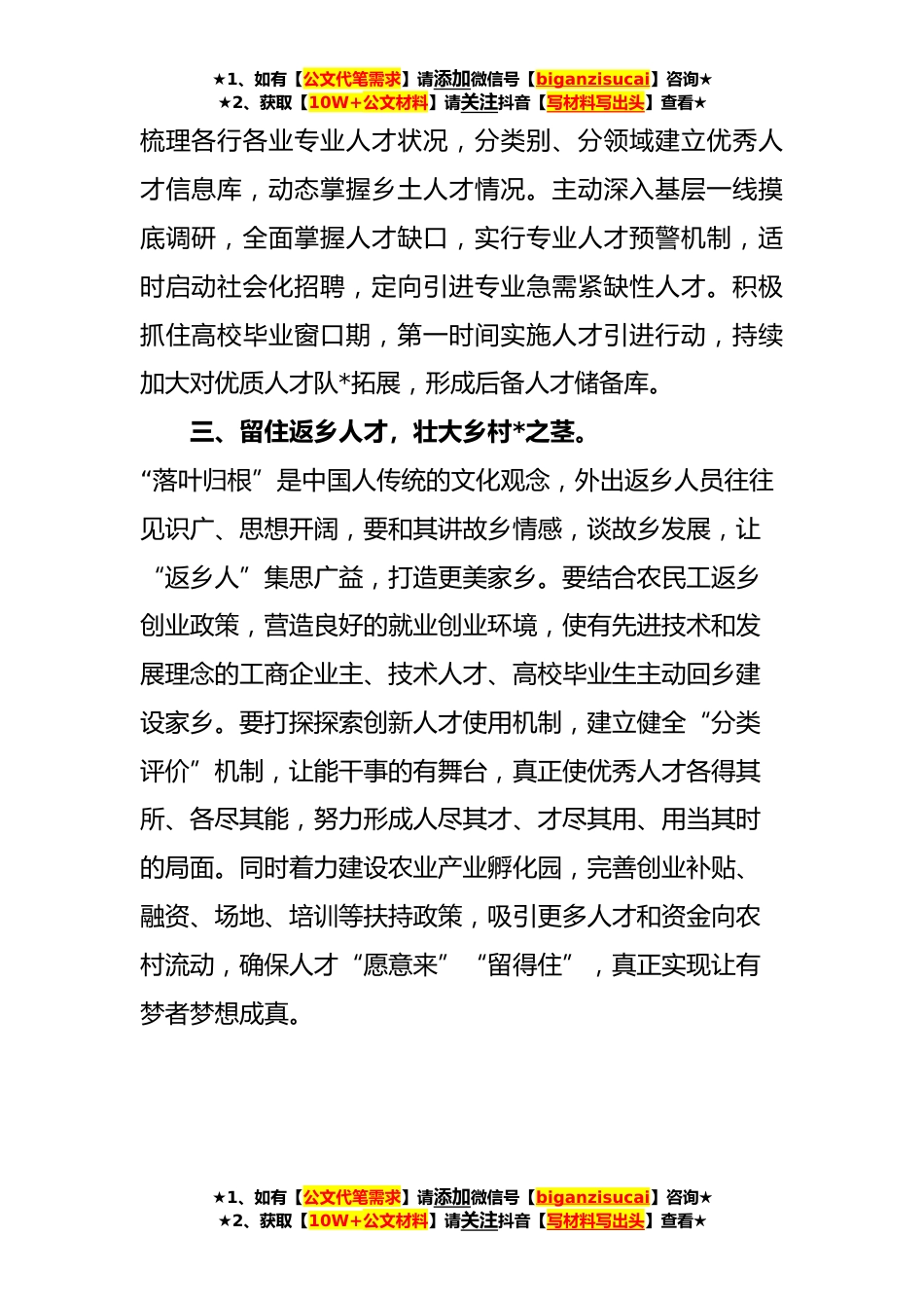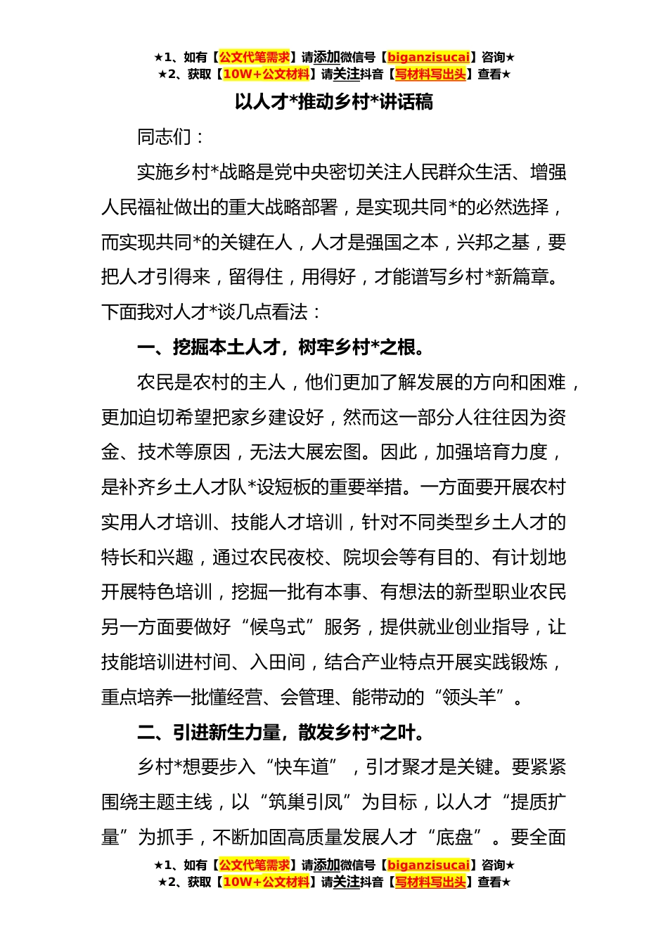★1、如有【公文代笔需求】请添加微信号【biganzisucai】咨询★★2、获取【10W+公文材料】请关注抖音【写材料写出头】查看★以人才*推动乡村*讲话稿同志们:实施乡村*战略是党中央密切关注人民群众生活、增强人民福祉做出的重大战略部署,是实现共同*的必然选择,而实现共同*的关键在人,人才是强国之本,兴邦之基,要把人才引得来,留得住,用得好,才能谱写乡村*新篇章。下面我对人才*谈几点看法:一、挖掘本土人才,树牢乡村*之根。农民是农村的主人,他们更加了解发展的方向和困难,更加迫切希望把家乡建设好,然而这一部分人往往因为资金、技术等原因,无法大展宏图。因此,加强培育力度,是补齐乡土人才队*设短板的重要举措。一方面要开展农村实用人才培训、技能人才培训,针对不同类型乡土人才的特长和兴趣...