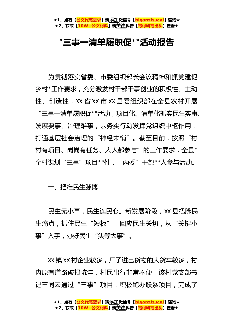 ★1、如有【公文代笔需求】请添加微信号【biganzisucai】咨询★★2、获取【10W+公文材料】请关注抖音【写材料写出头】查看★“三事一清单履职促*”活动报告为贯彻落实省委、市委组织部长会议精神和抓党建促乡村*工作要求,充分激发村干部干事创业的积极性、主动性、创造性,XX省XX市XX县委组织部在全县农村开展“三事一清单履职促*”活动,项目化、清单化抓实民生实事、发展要事、治理难事,以务实行动发挥党组织中枢作用,打通基层社会治理的“神经末梢”。截至目前,按照“村村有项目、岗岗有任务、人人都参与”的工作要求,全县*个村谋划“三事”项目**件,“两委”干部**人参与活动。一、把准民生脉搏民生无小事,民生连民心。新发展阶段,XX县把脉民生痛点,抓住民生“短板”,回应民生关切,从“关键小事”...