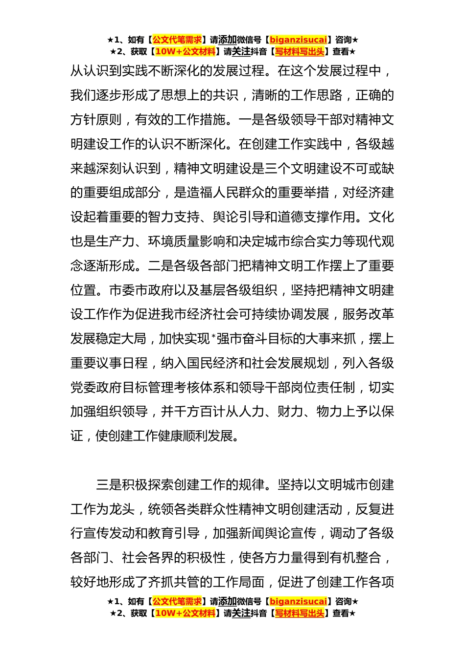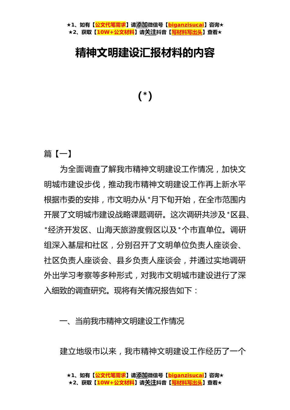 ★1、如有【公文代笔需求】请添加微信号【biganzisucai】咨询★★2、获取【10W+公文材料】请关注抖音【写材料写出头】查看★精神文明建设汇报材料的内容(*)篇【一】为全面调查了解我市精神文明建设工作情况,加快文明城市建设步伐,推动我市精神文明建设工作再上新水平根据市委的安排,市文明办从*月下旬开始,在全市范围内开展了文明城市建设战略课题调研。这次调研共涉及*区县、*经济开发区、山海天旅游度假区以及*个市直单位。调研组深入基层和社区,分别召开了文明单位负责人座谈会、社区负责人座谈会、县乡负责人座谈会,并通过实地调研外出学习考察等多种形式,对我市文明城市建设进行了深入细致的调查研究。现将有关情况报告如下:一、当前我市精神文明建设工作情况建立地级市以来,我市精神文明建设工作...
