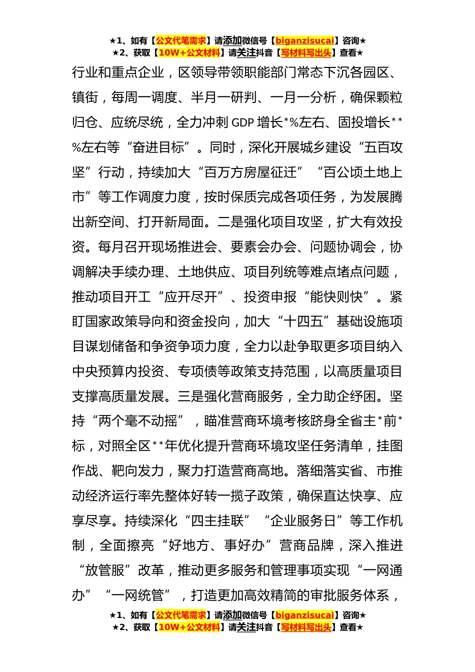 ★1、如有【公文代笔需求】请添加微信号【biganzisucai】咨询★★2、获取【10W+公文材料】请关注抖音【写材料写出头】查看★**年二季度经济指标调度会上的发言稿各位领导,同志们:二季度是承上启下的关键阶段,是实现“双过半”的攻坚期,对完成全年的工作目标任务至关重要。作为区政府常务工作负责人,我将坚持以党的二十大精神为指引,常学常新、常悟常进,切实做到用新思想武装头脑、指导实践,统筹抓好当前各项工作,奋力推动**经济社会发展实现新突破。一、积极践行新发展理念。党的十八大以来,我国坚定不移贯彻新发展理念,经济社会发展实现新的跃升。党的二十大报告进一步强调,贯彻新发展理念是新时代我国发展壮大的必由之路。新征程上,我们将更加自觉地把新发展理念作为行动先导,牢牢把握“高质量发...