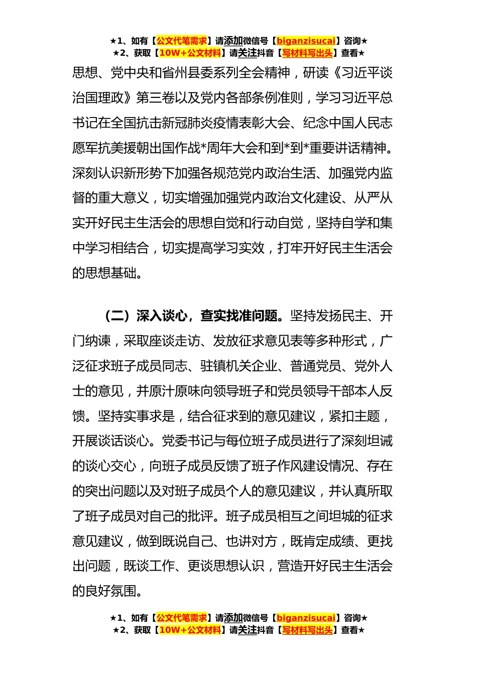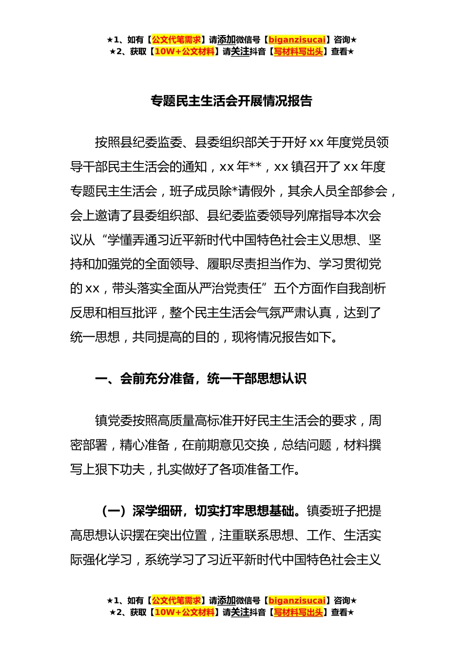 ★1、如有【公文代笔需求】请添加微信号【biganzisucai】咨询★★2、获取【10W+公文材料】请关注抖音【写材料写出头】查看★专题民主生活会开展情况报告按照县纪委监委、县委组织部关于开好xx年度党员领导干部民主生活会的通知,xx年**,xx镇召开了xx年度专题民主生活会,班子成员除*请假外,其余人员全部参会,会上邀请了县委组织部、县纪委监委领导列席指导本次会议从“学懂弄通习近平新时代中国特色社会主义思想、坚持和加强党的全面领导、履职尽责担当作为、学习贯彻党的xx,带头落实全面从严治党责任”五个方面作自我剖析反思和相互批评,整个民主生活会气氛严肃认真,达到了统一思想,共同提高的目的,现将情况报告如下。一、会前充分准备,统一干部思想认识镇党委按照高质量高标准开好民主生活会的要求,周...