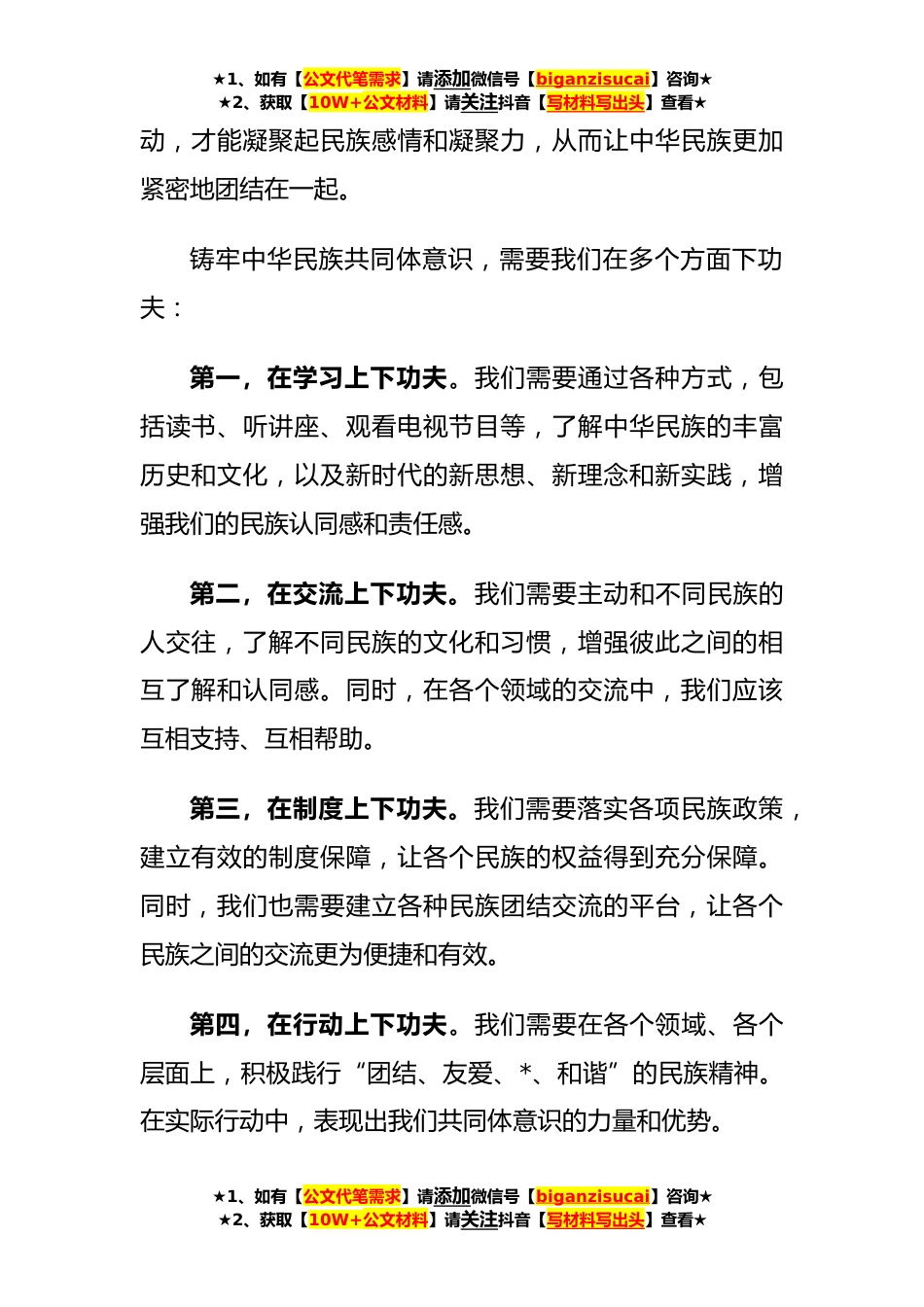 ★1、如有【公文代笔需求】请添加微信号【biganzisucai】咨询★★2、获取【10W+公文材料】请关注抖音【写材料写出头】查看★铸牢中华民族共同体意识发言材料尊敬的领导、各位嘉宾、亲爱的同胞们:我们现今的中国,正面临着着眼全球的转型升级、高质量发展的新阶段。我相信,这其中的一个核心点就是:铸牢中华民族共同体意识。中华民族,一方面是有悠久的历史、深厚的文化、众多的人口和广阔的国土,另一方面,也经历了各种困难和屈辱的历史。今天,我们正处在中华民族发展的重要历史时刻,我们要牢记历史长河,珍惜来之不易的现在,勇担新历史使命,为了实现中华民族伟大*而不断*。面对日益增多的国际竞争和挑战,我们应该更加清醒地认识到,只有紧密团结得到广泛支持,才能在国际舞台上获得更大的发展空间和更多...
