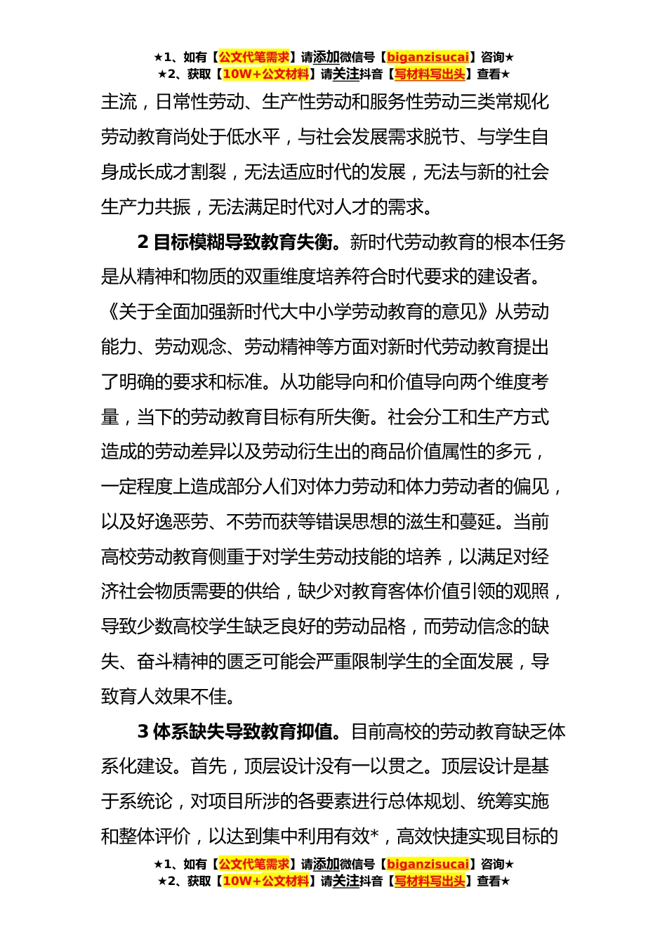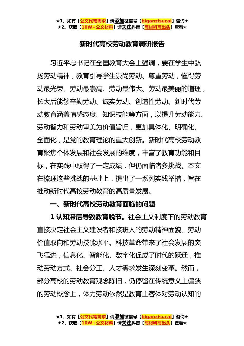 ★1、如有【公文代笔需求】请添加微信号【biganzisucai】咨询★★2、获取【10W+公文材料】请关注抖音【写材料写出头】查看★新时代高校劳动教育调研报告习近平总书记在全国教育大会上强调,要在学生中弘扬劳动精神,教育引导学生崇尚劳动、尊重劳动,懂得劳动最光荣、劳动最崇高、劳动最伟大、劳动最美丽的道理,长大后能够辛勤劳动、诚实劳动、创造性劳动。新时代劳动教育涵盖情感态度、知识技能等方面,以提升劳动能力、劳动智力和劳动审美为价值旨归,更加具体化、明确化、全面化,是党的教育理论的重大创新。新时代高校劳动教育聚焦个体发展和社会发展的维度,丰富了教育功能和目标,在实践中取得了一定成绩,但仍面临诸多挑战。本文在梳理这些挑战的基础上,提出了一系列实践举措,旨在推动新时代高校劳动教...