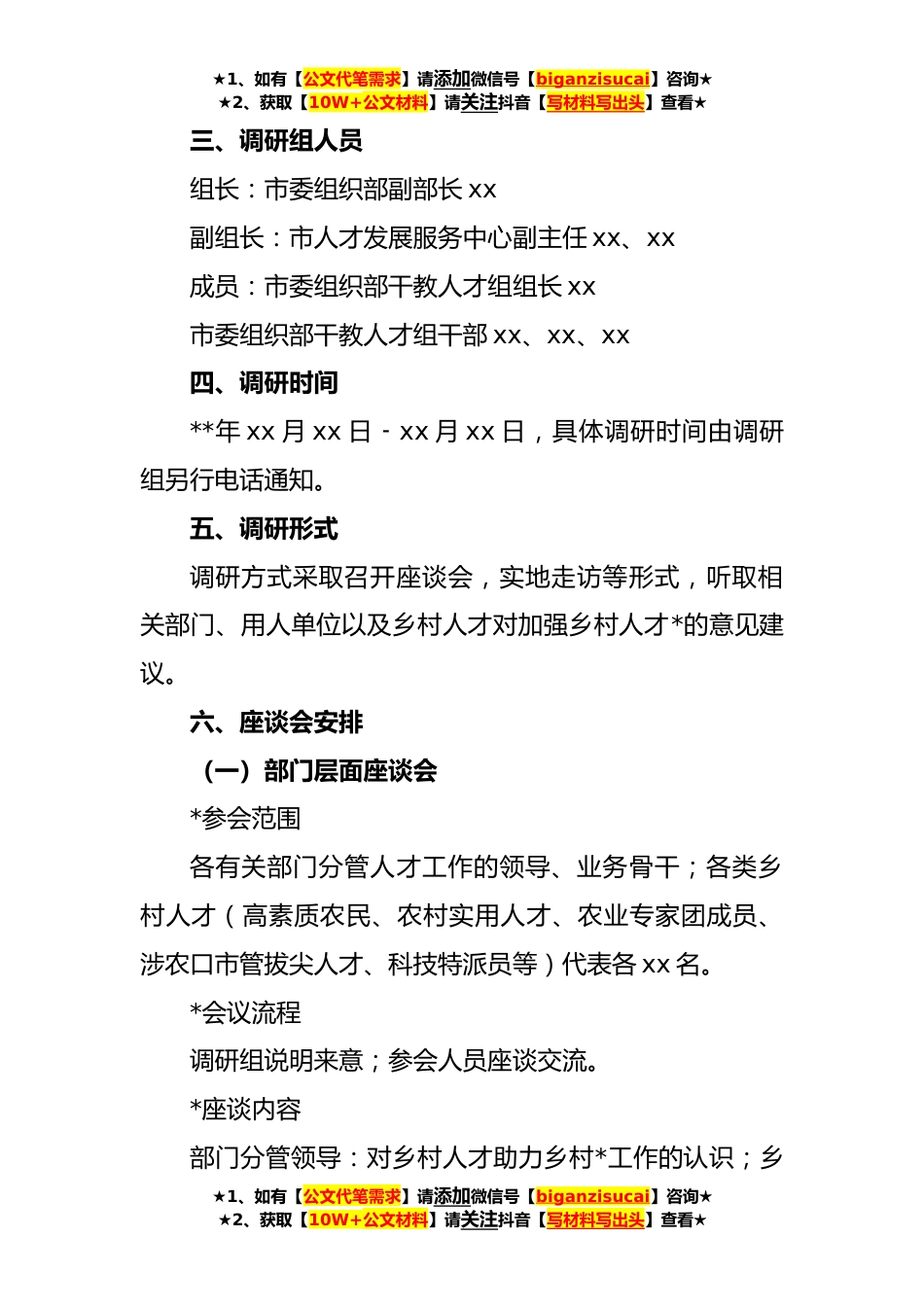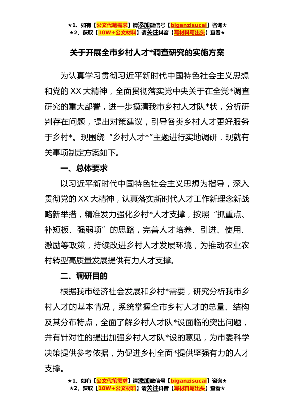 ★1、如有【公文代笔需求】请添加微信号【biganzisucai】咨询★★2、获取【10W+公文材料】请关注抖音【写材料写出头】查看★关于开展全市乡村人才*调查研究的实施方案为认真学习贯彻习近平新时代中国特色社会主义思想和党的XX大精神,全面贯彻落实党中央关于在全党*调查研究的重大部署,进一步摸清我市乡村人才队*状,分析研判存在问题,提出对策建议,引导各类乡村人才更好服务于乡村*。现围绕“乡村人才*”主题进行实地调研,现就有关事项制定方案如下。一、总体要求以习近平新时代中国特色社会主义思想为指导,深入贯彻党的XX大精神,认真落实新时代人才工作新理念新战略新举措,精准发力强化乡村*人才支撑,按照“抓重点、补短板、强弱项”的思路,完善人才培养、引进、使用、激励等政策,持续改进乡村人才发...