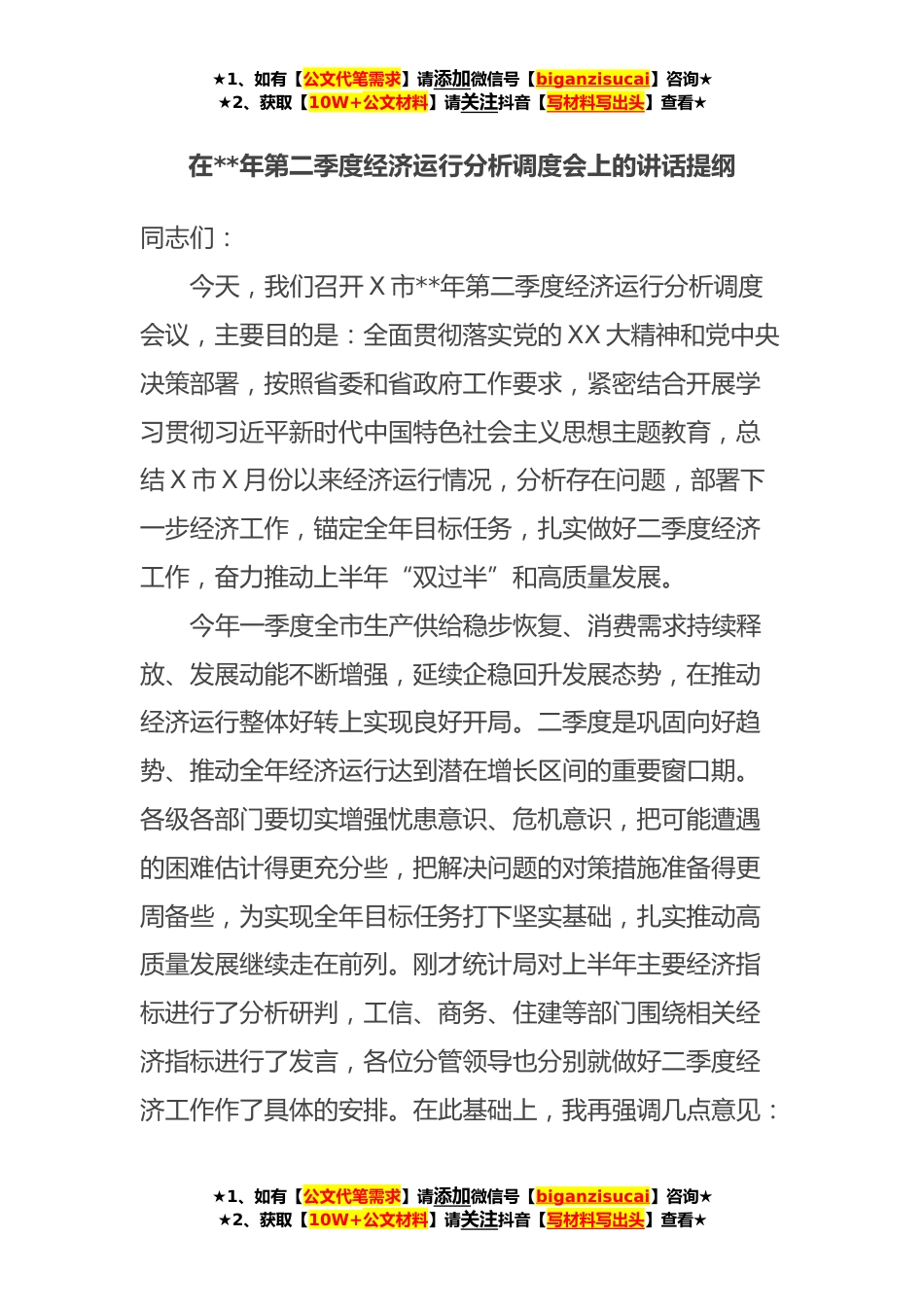 ★1、如有【公文代笔需求】请添加微信号【biganzisucai】咨询★★2、获取【10W+公文材料】请关注抖音【写材料写出头】查看★在**年第二季度经济运行分析调度会上的讲话提纲同志们:今天,我们召开X市**年第二季度经济运行分析调度会议,主要目的是:全面贯彻落实党的XX大精神和党中央决策部署,按照省委和省政府工作要求,紧密结合开展学习贯彻习近平新时代中国特色社会主义思想主题教育,总结X市X月份以来经济运行情况,分析存在问题,部署下一步经济工作,锚定全年目标任务,扎实做好二季度经济工作,奋力推动上半年“双过半”和高质量发展。今年一季度全市生产供给稳步恢复、消费需求持续释放、发展动能不断增强,延续企稳回升发展态势,在推动经济运行整体好转上实现良好开局。二季度是巩固向好趋势、推动全年...
