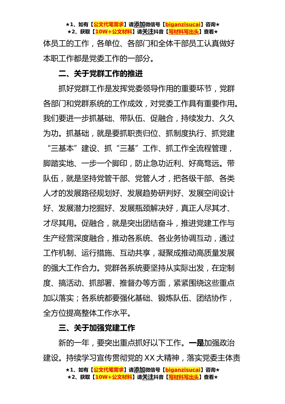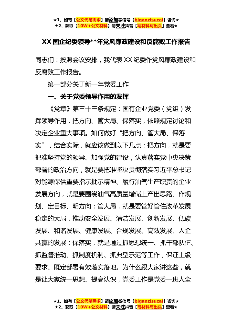 ★1、如有【公文代笔需求】请添加微信号【biganzisucai】咨询★★2、获取【10W+公文材料】请关注抖音【写材料写出头】查看★XX国企纪委领导**年党风廉政建设和反腐败工作报告同志们:按照会议安排,我代表XX纪委作党风廉政建设和反腐败工作报告。第一部分关于新一年党委工作一、关于党委领导作用的发挥《党章》第三十三条规定:国有企业党委(党组)发挥领导作用,把方向、管大局、保落实,依照规定讨论和决定企业重大事项。如何做好“把方向、管大局、保落实”,结合实际,就应该做到以下几点:把方向,就是要把准坚持党的领导、加强党的建设,认真落实党中央决策部署的政治方向,就是要把准坚决贯彻落实习近平总书记对能源保供重要指示批示精神、履行油气生产职责的企业发展方向,就是要围绕油气高质量增储上产...