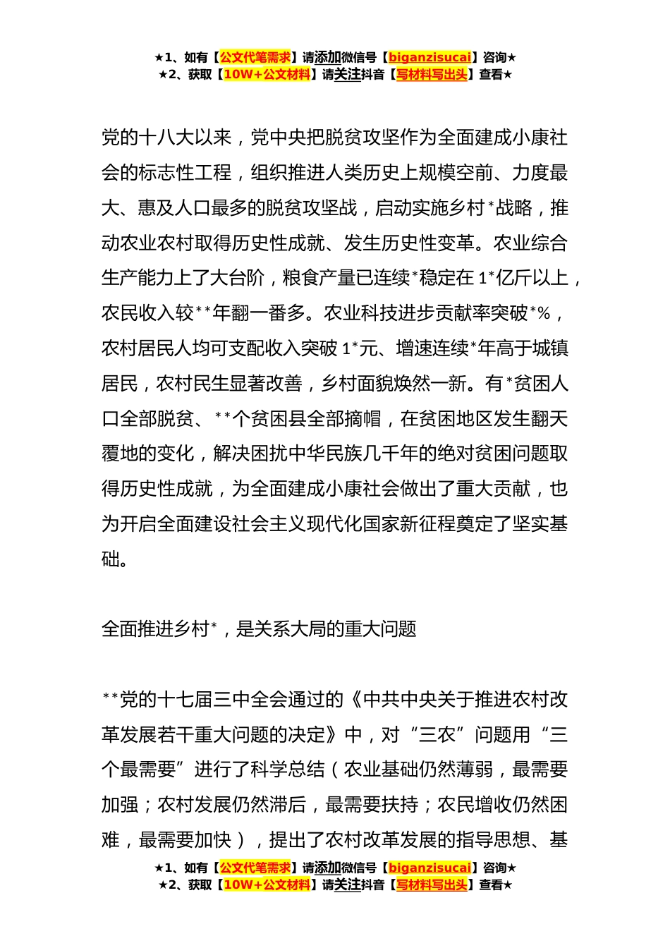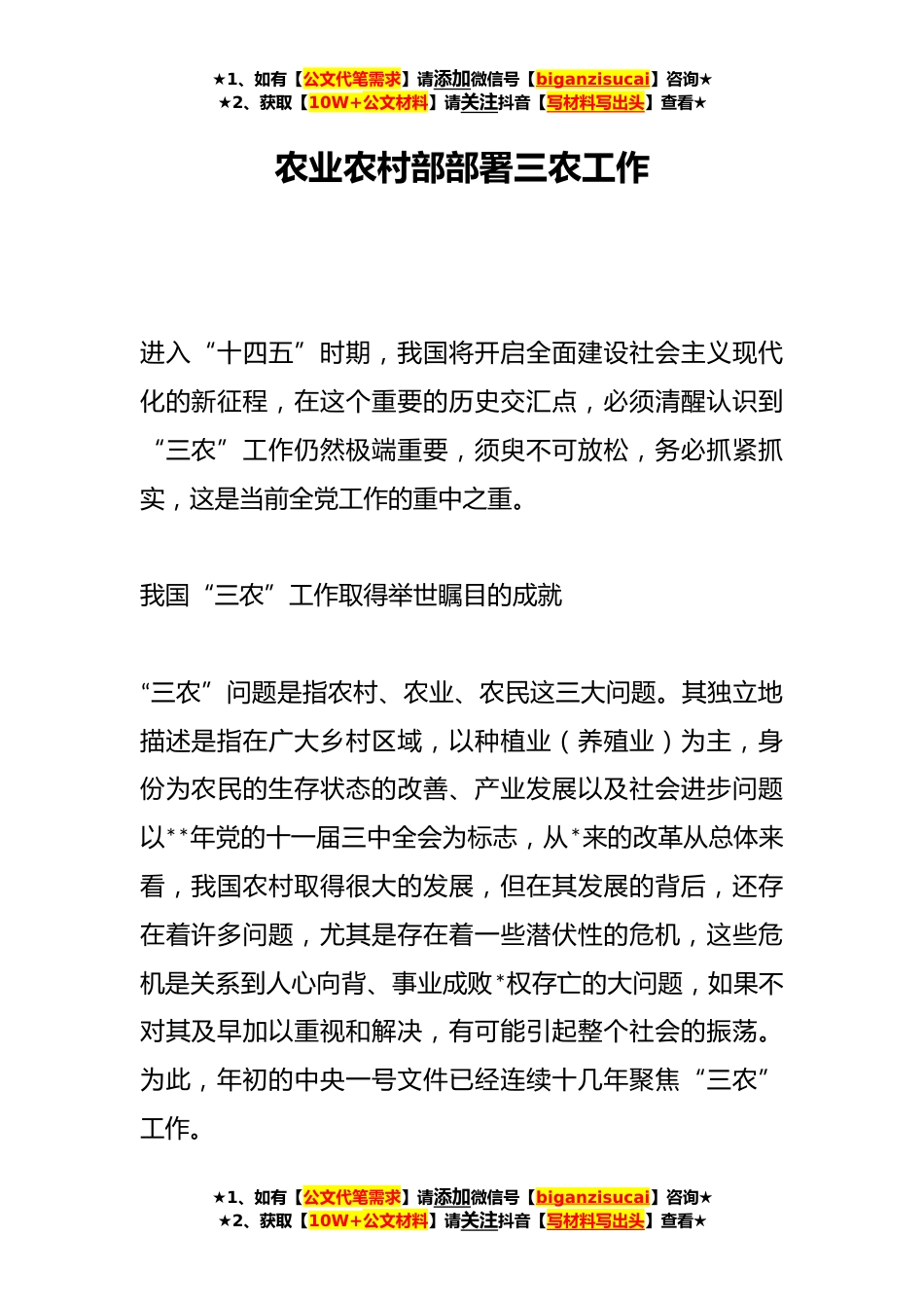 ★1、如有【公文代笔需求】请添加微信号【biganzisucai】咨询★★2、获取【10W+公文材料】请关注抖音【写材料写出头】查看★农业农村部部署三农工作进入“十四五”时期,我国将开启全面建设社会主义现代化的新征程,在这个重要的历史交汇点,必须清醒认识到“三农”工作仍然极端重要,须臾不可放松,务必抓紧抓实,这是当前全党工作的重中之重。我国“三农”工作取得举世瞩目的成就“三农”问题是指农村、农业、农民这三大问题。其独立地描述是指在广大乡村区域,以种植业(养殖业)为主,身份为农民的生存状态的改善、产业发展以及社会进步问题以**年党的十一届三中全会为标志,从*来的改革从总体来看,我国农村取得很大的发展,但在其发展的背后,还存在着许多问题,尤其是存在着一些潜伏性的危机,这些危机是关...
