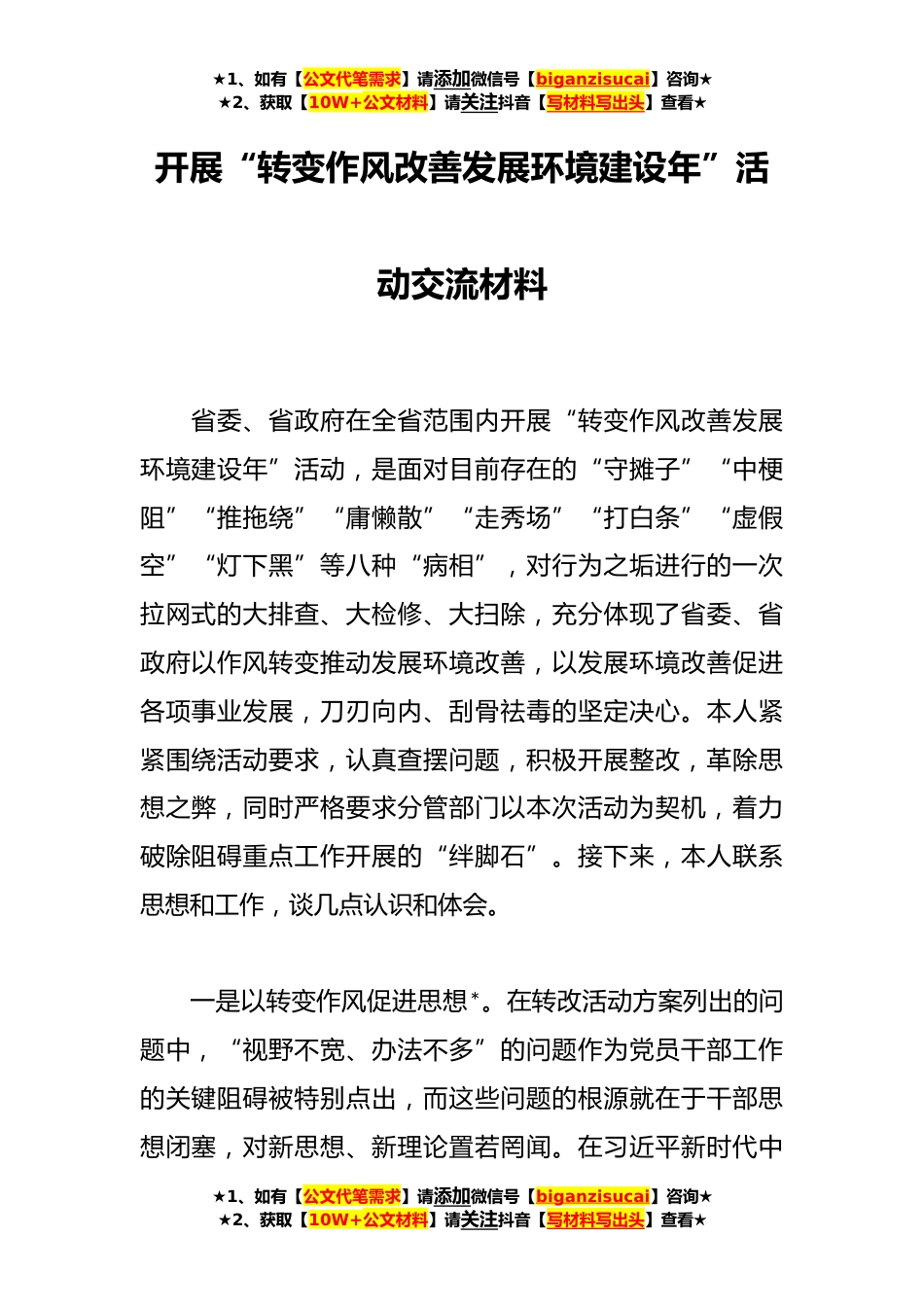 ★1、如有【公文代笔需求】请添加微信号【biganzisucai】咨询★★2、获取【10W+公文材料】请关注抖音【写材料写出头】查看★开展“转变作风改善发展环境建设年”活动交流材料省委、省政府在全省范围内开展“转变作风改善发展环境建设年”活动,是面对目前存在的“守摊子”“中梗阻”“推拖绕”“庸懒散”“走秀场”“打白条”“虚假空”“灯下黑”等八种“病相”,对行为之垢进行的一次拉网式的大排查、大检修、大扫除,充分体现了省委、省政府以作风转变推动发展环境改善,以发展环境改善促进各项事业发展,刀刃向内、刮骨祛毒的坚定决心。本人紧紧围绕活动要求,认真查摆问题,积极开展整改,革除思想之弊,同时严格要求分管部门以本次活动为契机,着力破除阻碍重点工作开展的“绊脚石”。接下来,本人联系思想...
