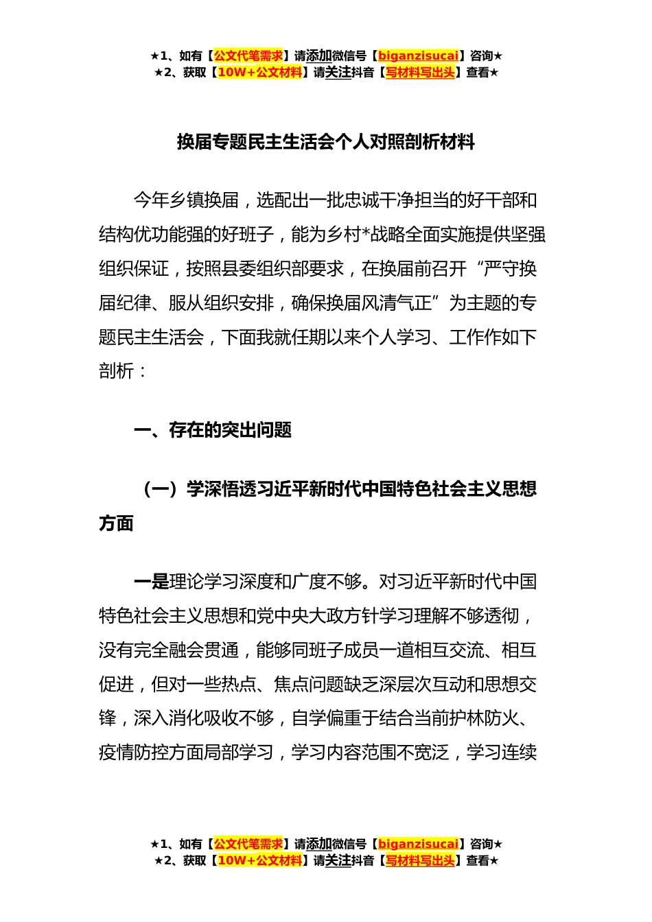 ★1、如有【公文代笔需求】请添加微信号【biganzisucai】咨询★★2、获取【10W+公文材料】请关注抖音【写材料写出头】查看★换届专题民主生活会个人对照剖析材料今年乡镇换届,选配出一批忠诚干净担当的好干部和结构优功能强的好班子,能为乡村*战略全面实施提供坚强组织保证,按照县委组织部要求,在换届前召开“严守换届纪律、服从组织安排,确保换届风清气正”为主题的专题民主生活会,下面我就任期以来个人学习、工作作如下剖析:一、存在的突出问题(一)学深悟透习近平新时代中国特色社会主义思想方面一是理论学习深度和广度不够。对习近平新时代中国特色社会主义思想和党中央大政方针学习理解不够透彻,没有完全融会贯通,能够同班子成员一道相互交流、相互促进,但对一些热点、焦点问题缺乏深层次互动和思...