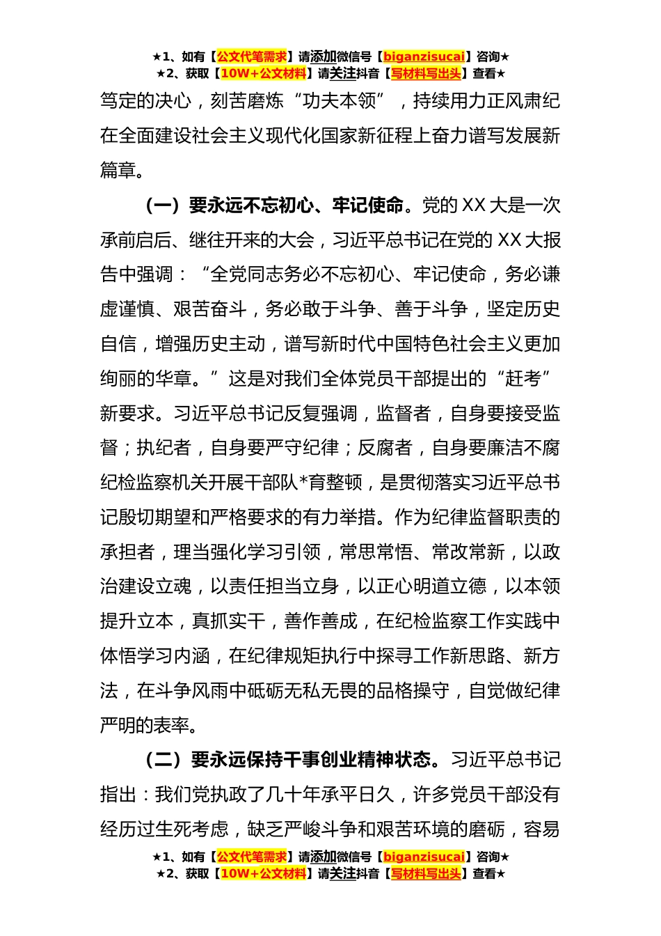 ★1、如有【公文代笔需求】请添加微信号【biganzisucai】咨询★★2、获取【10W+公文材料】请关注抖音【写材料写出头】查看★廉政党课:借纪检监察干部队*育整顿之“力”塑清正廉洁之“风”同志们:开展纪检监察干部队*育整顿,是习近平总书记亲自点题、中共中央直接部署的一项重要政治任务,体现了对纪检监察干部寄予的高度关切与殷切期望,有着极其深刻的现实意义。此次教育整顿,把基层单位机关纪检监察干部全员纳入,所涵盖的人员范围广、要求严、标准高,释放出全面从严治党全覆盖、无死角、*忍,越往后越严的强烈信号。目的就是要通过教育整顿,纯洁思想,纯洁组织,着力打造一支忠诚干净担当、敢于善于斗争的高素质纪检监察铁军。今天,我给同志们讲一次党课,主要围绕三个方面与大家一起学习,共同提高。一...