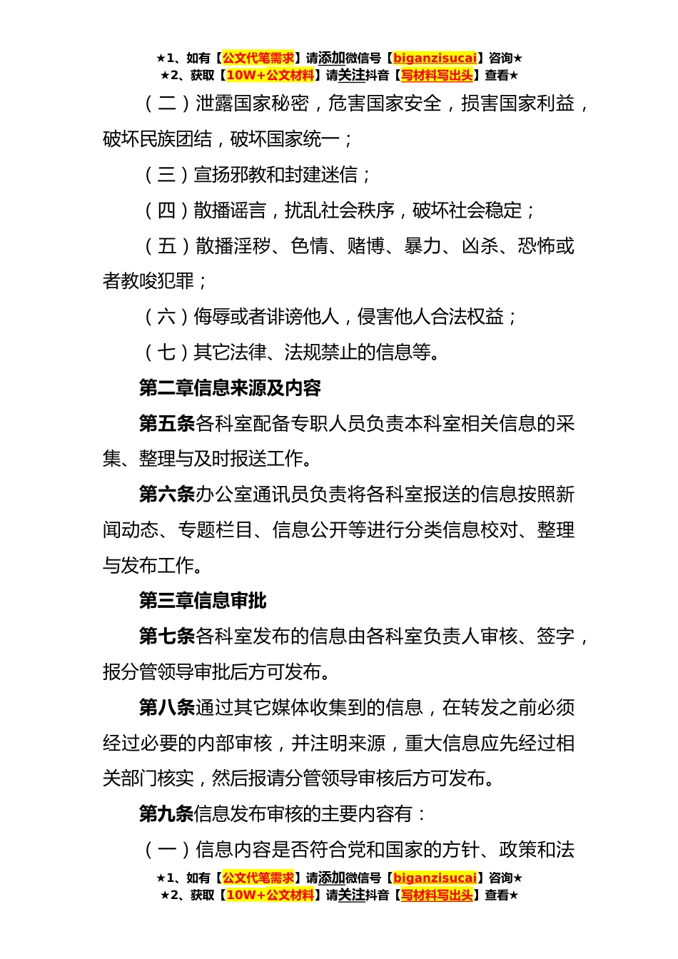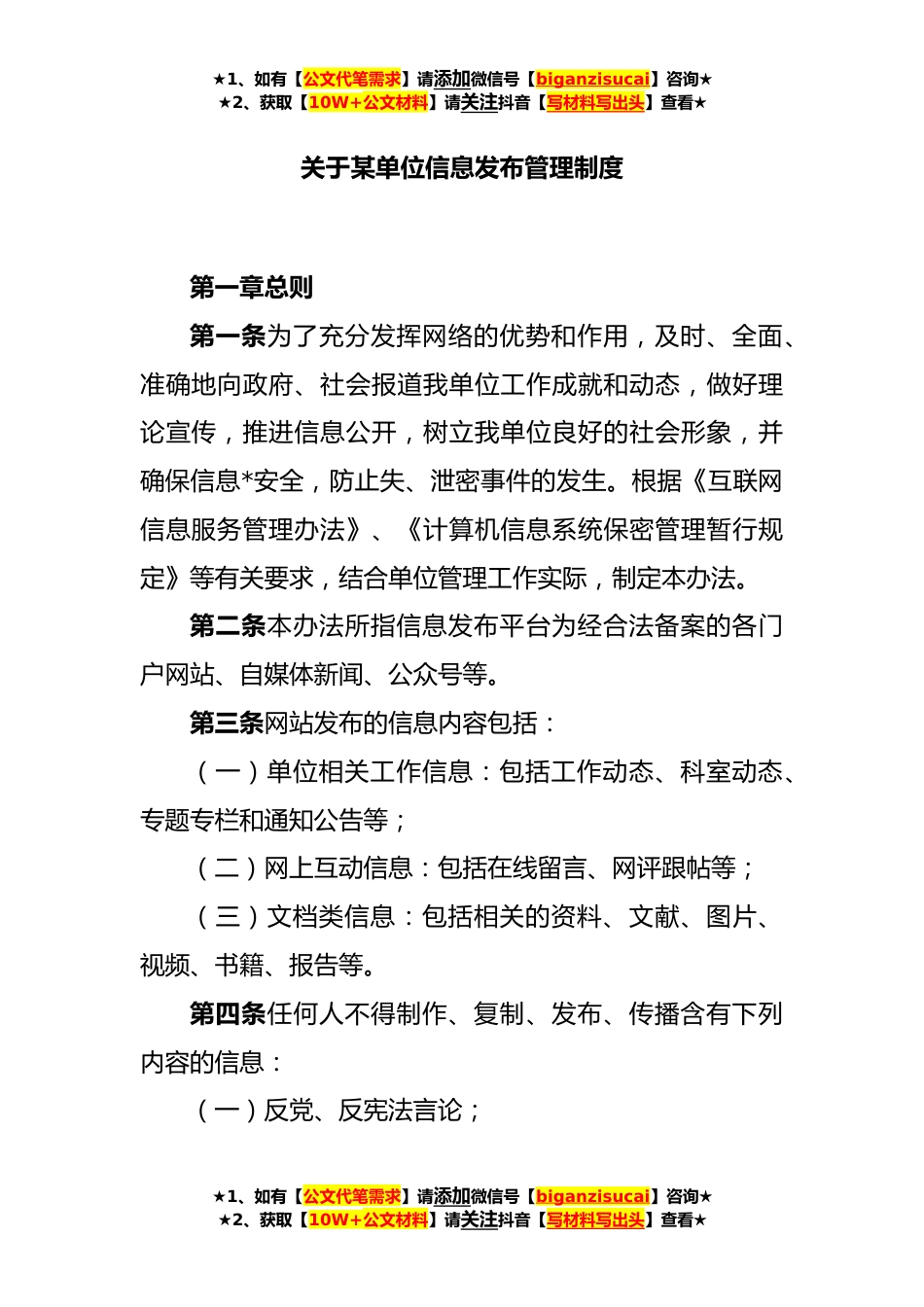 ★1、如有【公文代笔需求】请添加微信号【biganzisucai】咨询★★2、获取【10W+公文材料】请关注抖音【写材料写出头】查看★关于某单位信息发布管理制度第一章总则第一条为了充分发挥网络的优势和作用,及时、全面、准确地向政府、社会报道我单位工作成就和动态,做好理论宣传,推进信息公开,树立我单位良好的社会形象,并确保信息*安全,防止失、泄密事件的发生。根据《互联网信息服务管理办法》、《计算机信息系统保密管理暂行规定》等有关要求,结合单位管理工作实际,制定本办法。第二条本办法所指信息发布平台为经合法备案的各门户网站、自媒体新闻、公众号等。第三条网站发布的信息内容包括:(一)单位相关工作信息:包括工作动态、科室动态、专题专栏和通知公告等;(二)网上互动信息:包括在线留言、网...