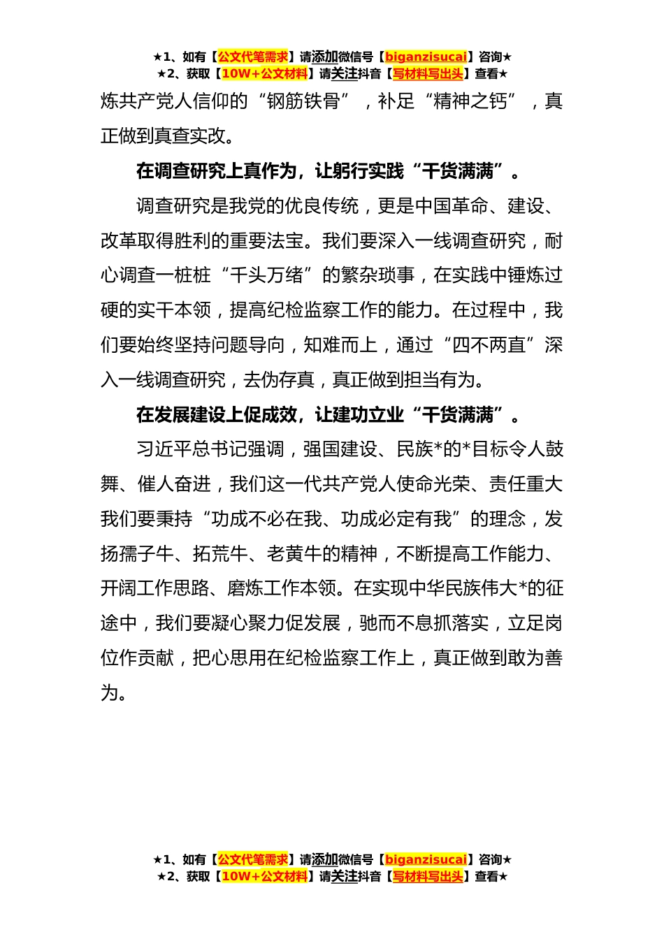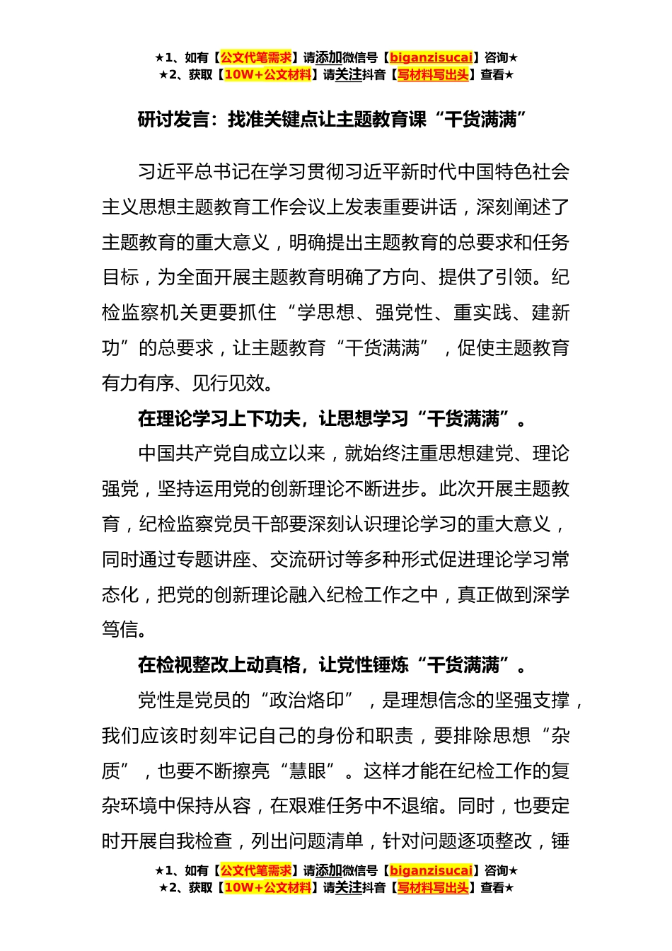★1、如有【公文代笔需求】请添加微信号【biganzisucai】咨询★★2、获取【10W+公文材料】请关注抖音【写材料写出头】查看★研讨发言:找准关键点让主题教育课“干货满满”习近平总书记在学习贯彻习近平新时代中国特色社会主义思想主题教育工作会议上发表重要讲话,深刻阐述了主题教育的重大意义,明确提出主题教育的总要求和任务目标,为全面开展主题教育明确了方向、提供了引领。纪检监察机关更要抓住“学思想、强党性、重实践、建新功”的总要求,让主题教育“干货满满”,促使主题教育有力有序、见行见效。在理论学习上下功夫,让思想学习“干货满满”。中国共产党自成立以来,就始终注重思想建党、理论强党,坚持运用党的创新理论不断进步。此次开展主题教育,纪检监察党员干部要深刻认识理论学习的重大意义...
