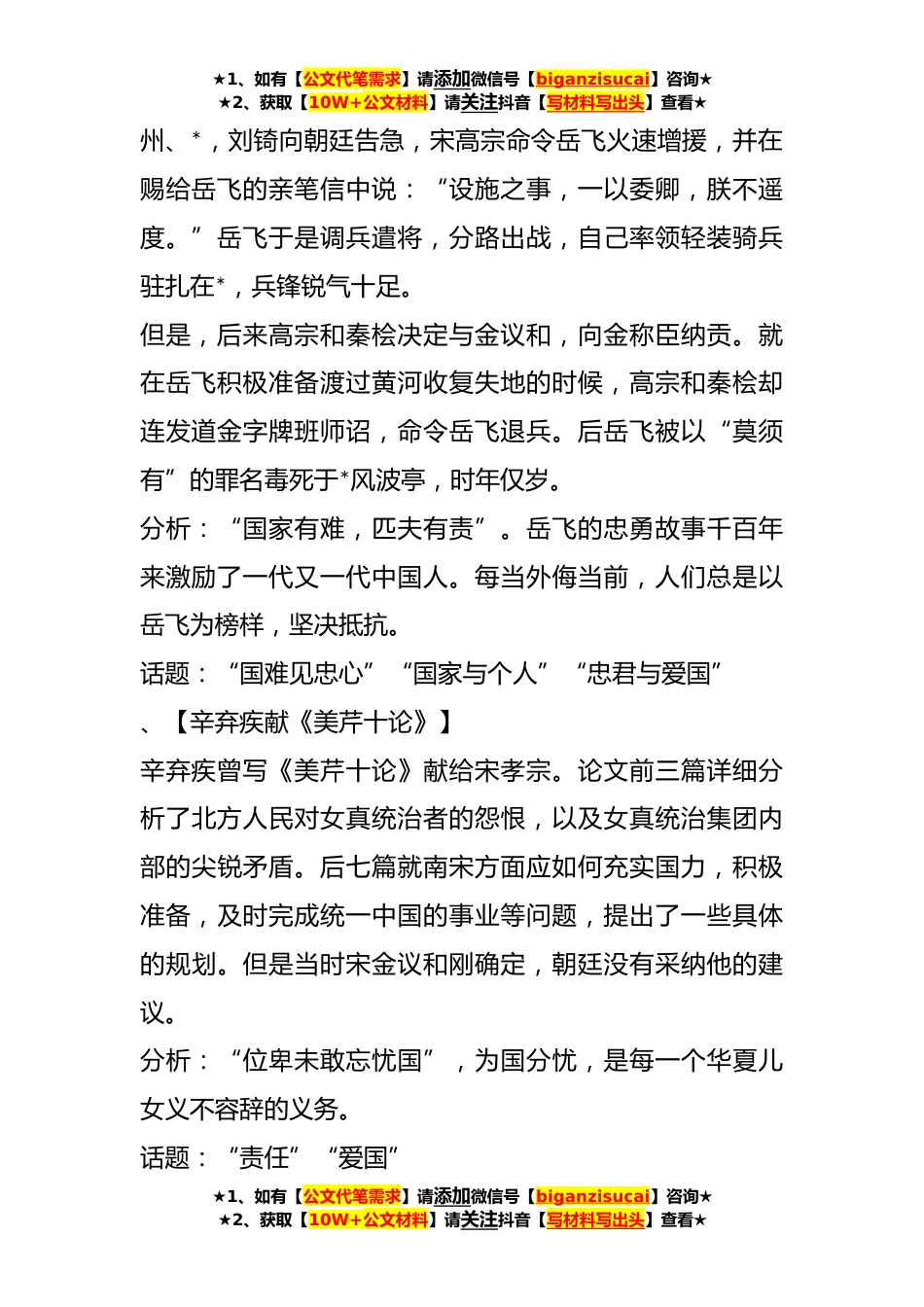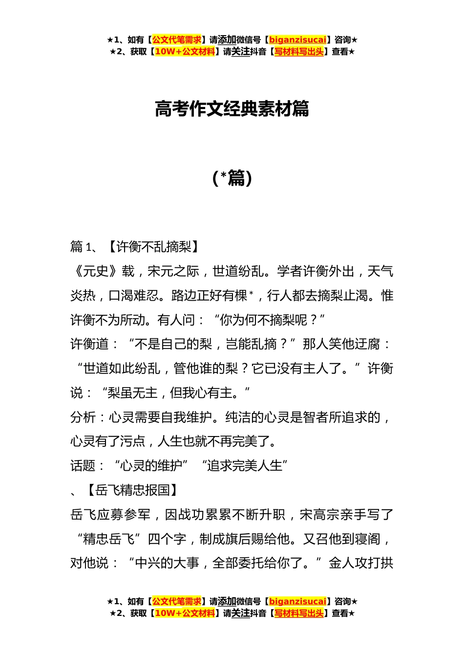 ★1、如有【公文代笔需求】请添加微信号【biganzisucai】咨询★★2、获取【10W+公文材料】请关注抖音【写材料写出头】查看★高考作文经典素材篇(*篇)篇1、【许衡不乱摘梨】《元史》载,宋元之际,世道纷乱。学者许衡外出,天气炎热,口渴难忍。路边正好有棵*,行人都去摘梨止渴。惟许衡不为所动。有人问:“你为何不摘梨呢?”许衡道:“不是自己的梨,岂能乱摘?”那人笑他迂腐:“世道如此纷乱,管他谁的梨?它已没有主人了。”许衡说:“梨虽无主,但我心有主。”分析:心灵需要自我维护。纯洁的心灵是智者所追求的,心灵有了污点,人生也就不再完美了。话题:“心灵的维护”“追求完美人生”、【岳飞精忠报国】岳飞应募参军,因战功累累不断升职,宋高宗亲手写了“精忠岳飞”四个字,制成旗后赐给他。又召他...
