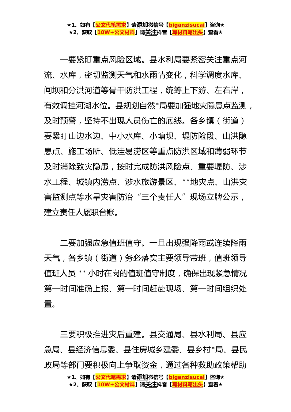 ★1、如有【公文代笔需求】请添加微信号【biganzisucai】咨询★★2、获取【10W+公文材料】请关注抖音【写材料写出头】查看★在**上半年县安委会*减灾委会议上的部署讲话稿同志们:今天,我们召开县安委会*减灾委**年第*次全体(扩大)会议。目的是对上半年全县安全生产与自然灾害防治工作进行再安排再部署再深化,确保下半年安全形势持续稳定。刚才,县安委办通报了前两季度安全生产与自然灾害防治工作整体情况和二季度综合督查情况;县规划自然*局、县水利局、县气象局、巴山镇、*镇、治*分别作了发言,几位同志讲得很好,希望大家认真学习领会,举一反三、狠抓落实。在奕锋县长讲话前,我将重点领域安全防范工作再作强调:一、全力以赴抓好洪涝灾害防御。汛期才刚刚开始,各级各部门切不可麻痹大意、安而忘危,...