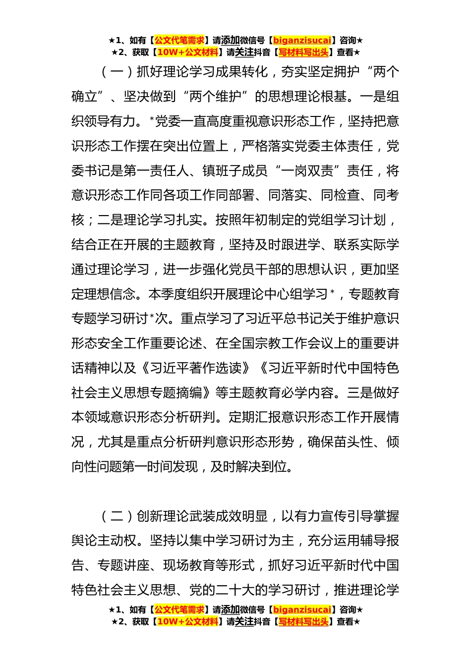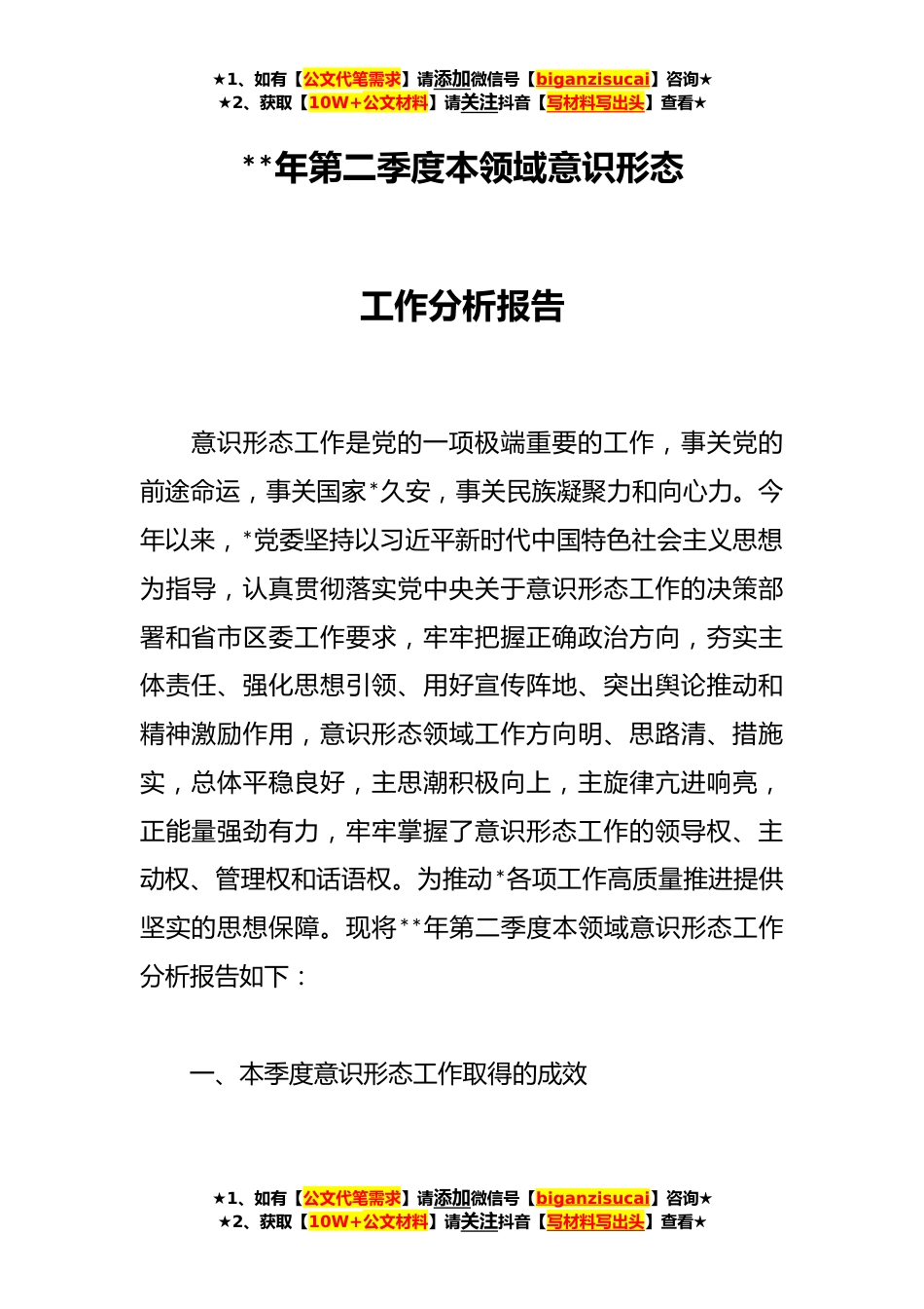 ★1、如有【公文代笔需求】请添加微信号【biganzisucai】咨询★★2、获取【10W+公文材料】请关注抖音【写材料写出头】查看★**年第二季度本领域意识形态工作分析报告意识形态工作是党的一项极端重要的工作,事关党的前途命运,事关国家*久安,事关民族凝聚力和向心力。今年以来,*党委坚持以习近平新时代中国特色社会主义思想为指导,认真贯彻落实党中央关于意识形态工作的决策部署和省市区委工作要求,牢牢把握正确政治方向,夯实主体责任、强化思想引领、用好宣传阵地、突出舆论推动和精神激励作用,意识形态领域工作方向明、思路清、措施实,总体平稳良好,主思潮积极向上,主旋律亢进响亮,正能量强劲有力,牢牢掌握了意识形态工作的领导权、主动权、管理权和话语权。为推动*各项工作高质量推进提供坚实的思想...