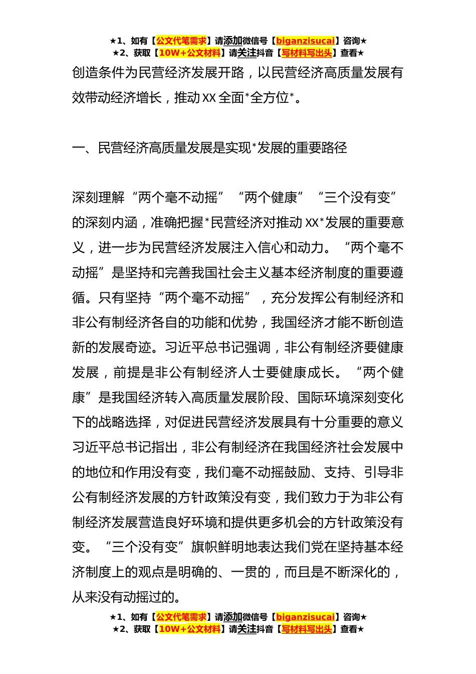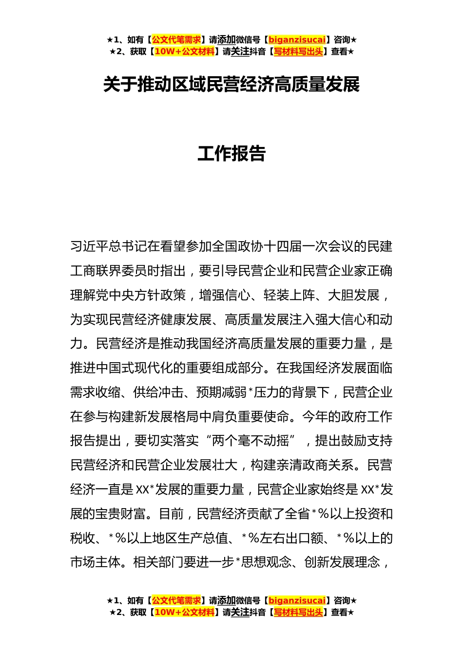 ★1、如有【公文代笔需求】请添加微信号【biganzisucai】咨询★★2、获取【10W+公文材料】请关注抖音【写材料写出头】查看★关于推动区域民营经济高质量发展工作报告习近平总书记在看望参加全国政协十四届一次会议的民建工商联界委员时指出,要引导民营企业和民营企业家正确理解党中央方针政策,增强信心、轻装上阵、大胆发展,为实现民营经济健康发展、高质量发展注入强大信心和动力。民营经济是推动我国经济高质量发展的重要力量,是推进中国式现代化的重要组成部分。在我国经济发展面临需求收缩、供给冲击、预期减弱*压力的背景下,民营企业在参与构建新发展格局中肩负重要使命。今年的政府工作报告提出,要切实落实“两个毫不动摇”,提出鼓励支持民营经济和民营企业发展壮大,构建亲清政商关系。民营经济一直...