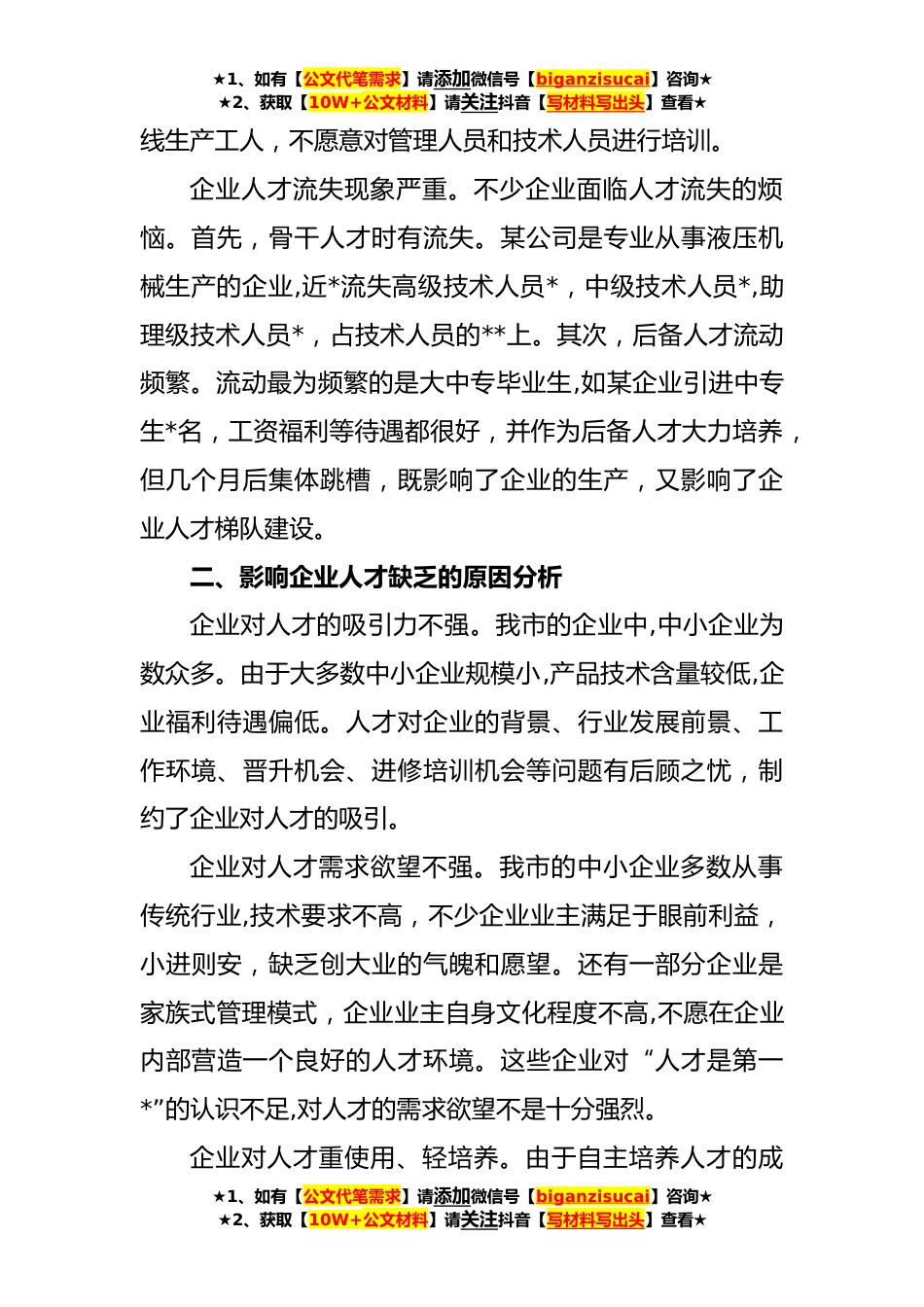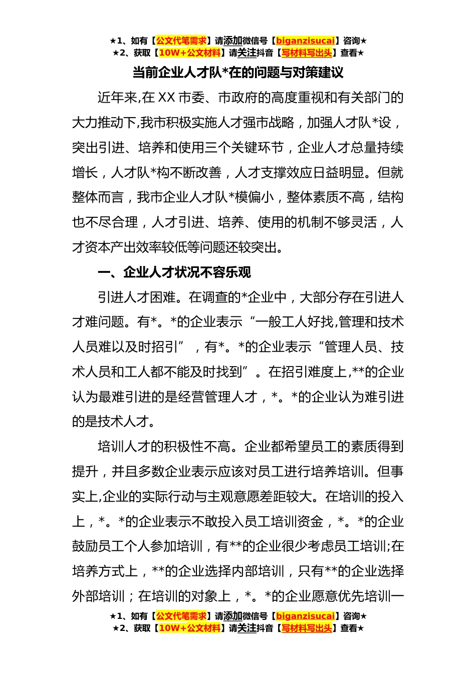 ★1、如有【公文代笔需求】请添加微信号【biganzisucai】咨询★★2、获取【10W+公文材料】请关注抖音【写材料写出头】查看★当前企业人才队*在的问题与对策建议近年来,在XX市委、市政府的高度重视和有关部门的大力推动下,我市积极实施人才强市战略,加强人才队*设,突出引进、培养和使用三个关键环节,企业人才总量持续增长,人才队*构不断改善,人才支撑效应日益明显。但就整体而言,我市企业人才队*模偏小,整体素质不高,结构也不尽合理,人才引进、培养、使用的机制不够灵活,人才资本产出效率较低等问题还较突出。一、企业人才状况不容乐观引进人才困难。在调查的*企业中,大部分存在引进人才难问题。有*。*的企业表示“一般工人好找,管理和技术人员难以及时招引”,有*。*的企业表示“管理人员、技术人员和...