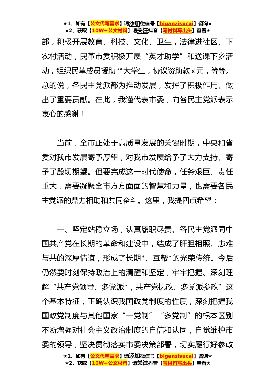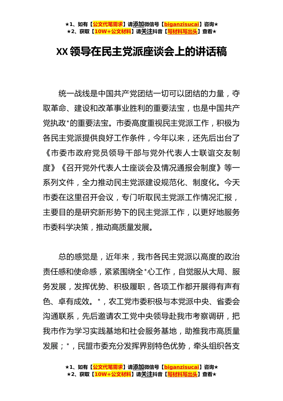 ★1、如有【公文代笔需求】请添加微信号【biganzisucai】咨询★★2、获取【10W+公文材料】请关注抖音【写材料写出头】查看★XX领导在民主党派座谈会上的讲话稿统一战线是中国共产党团结一切可以团结的力量,夺取革命、建设和改革事业胜利的重要法宝,也是中国共产党执政*的重要法宝。市委高度重视民主党派工作,积极为各民主党派提供良好工作条件,今年以来,还先后出台了《市委市政府党员领导干部与党外代表人士联谊交友制度》《召开党外代表人士座谈会及情况通报会制度》等一系列文件,全力推动民主党派建设规范化、制度化。今天市委在这里召开会议,专门听取民主党派工作情况汇报,主要目的是研究新形势下的民主党派工作,以更好地服务市委科学决策,推动高质量发展。总的感觉是,近年来,我市各民主党派以高度...