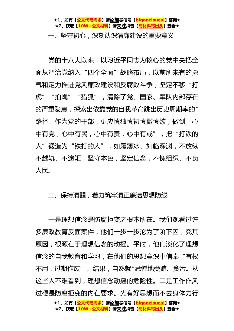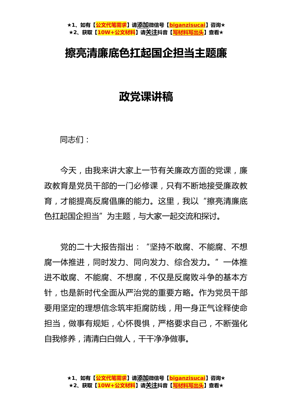 ★1、如有【公文代笔需求】请添加微信号【biganzisucai】咨询★★2、获取【10W+公文材料】请关注抖音【写材料写出头】查看★擦亮清廉底色扛起国企担当主题廉政党课讲稿同志们:今天,由我来讲大家上一节有关廉政方面的党课,廉政教育是党员干部的一门必修课,只有不断地接受廉政教育,才能提高反腐倡廉的能力。这里,我以“擦亮清廉底色扛起国企担当”为主题,与大家一起交流和探讨。党的二十大报告指出:“坚持不敢腐、不能腐、不想腐一体推进,同时发力、同向发力、综合发力。”一体推进不敢腐、不能腐、不想腐,不仅是反腐败斗争的基本方针,也是新时代全面从严治党的重要方略。作为党员干部要用坚定的理想信念筑牢拒腐防线,用一身正气诠释使命担当,做事有规矩,心怀畏惧,严格要求自己,不断强化自我修养,...