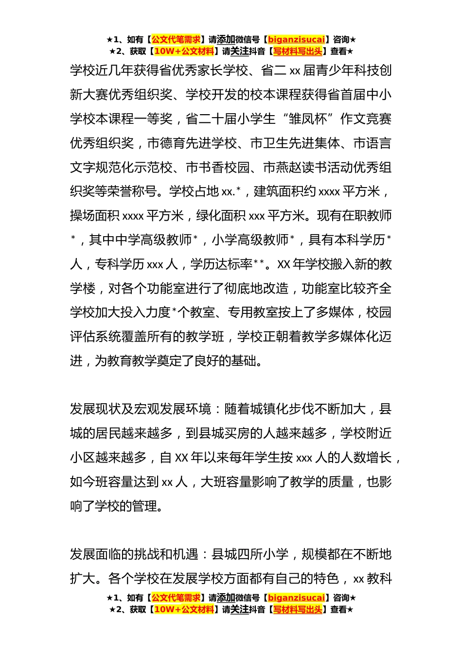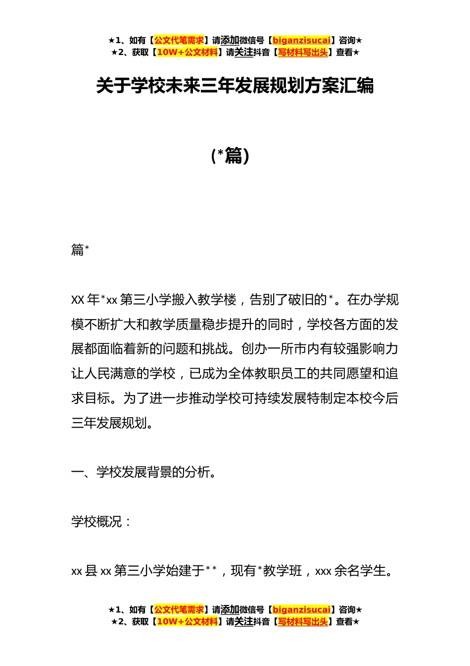 ★1、如有【公文代笔需求】请添加微信号【biganzisucai】咨询★★2、获取【10W+公文材料】请关注抖音【写材料写出头】查看★关于学校未来三年发展规划方案汇编(*篇)篇*XX年*xx第三小学搬入教学楼,告别了破旧的*。在办学规模不断扩大和教学质量稳步提升的同时,学校各方面的发展都面临着新的问题和挑战。创办一所市内有较强影响力让人民满意的学校,已成为全体教职员工的共同愿望和追求目标。为了进一步推动学校可持续发展特制定本校今后三年发展规划。一、学校发展背景的分析。学校概况:xx县xx第三小学始建于**,现有*教学班,xxx余名学生。★1、如有【公文代笔需求】请添加微信号【biganzisucai】咨询★★2、获取【10W+公文材料】请关注抖音【写材料写出头】查看★★1、如有【公文代笔需求】请添加微信号【big...